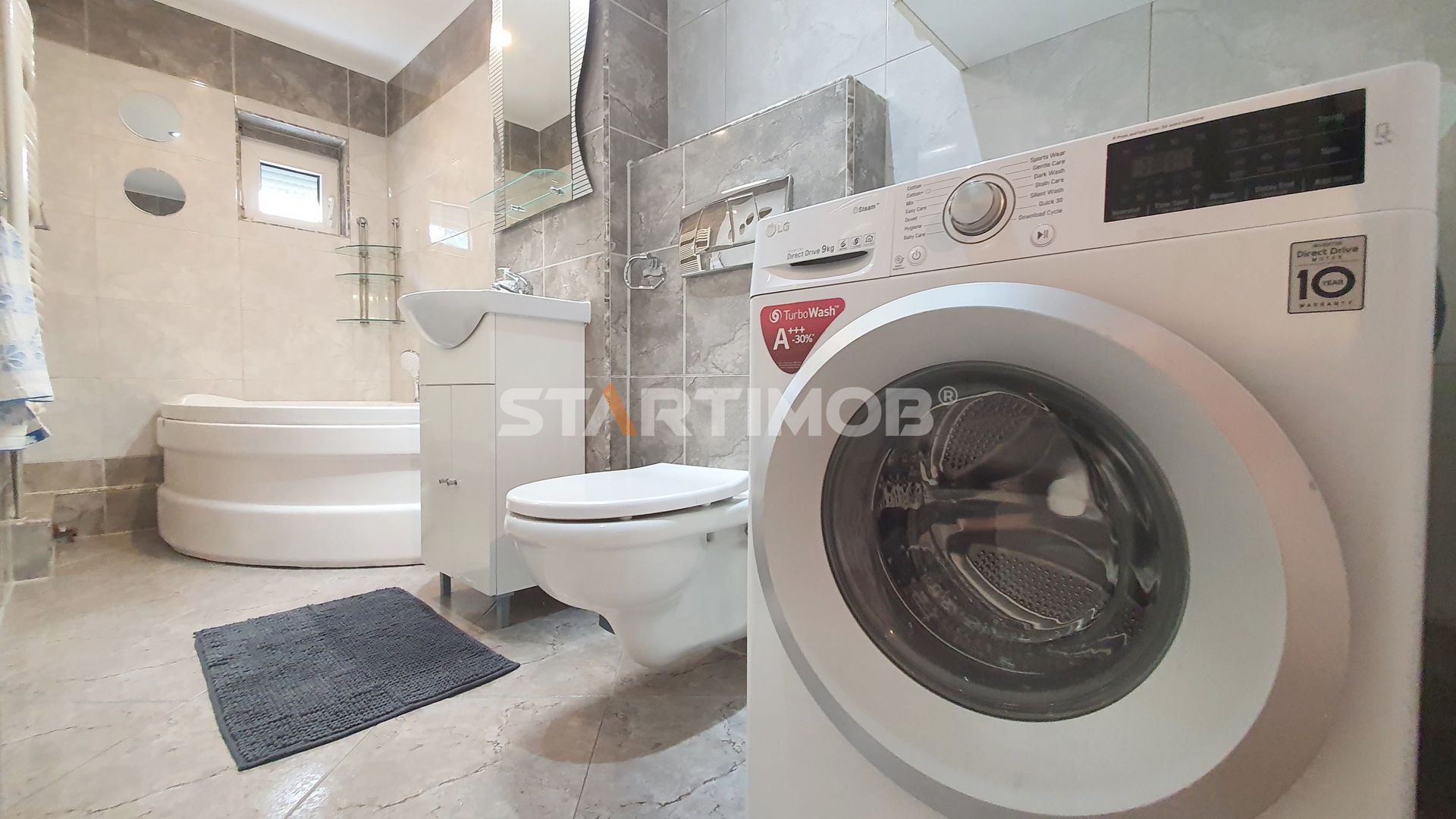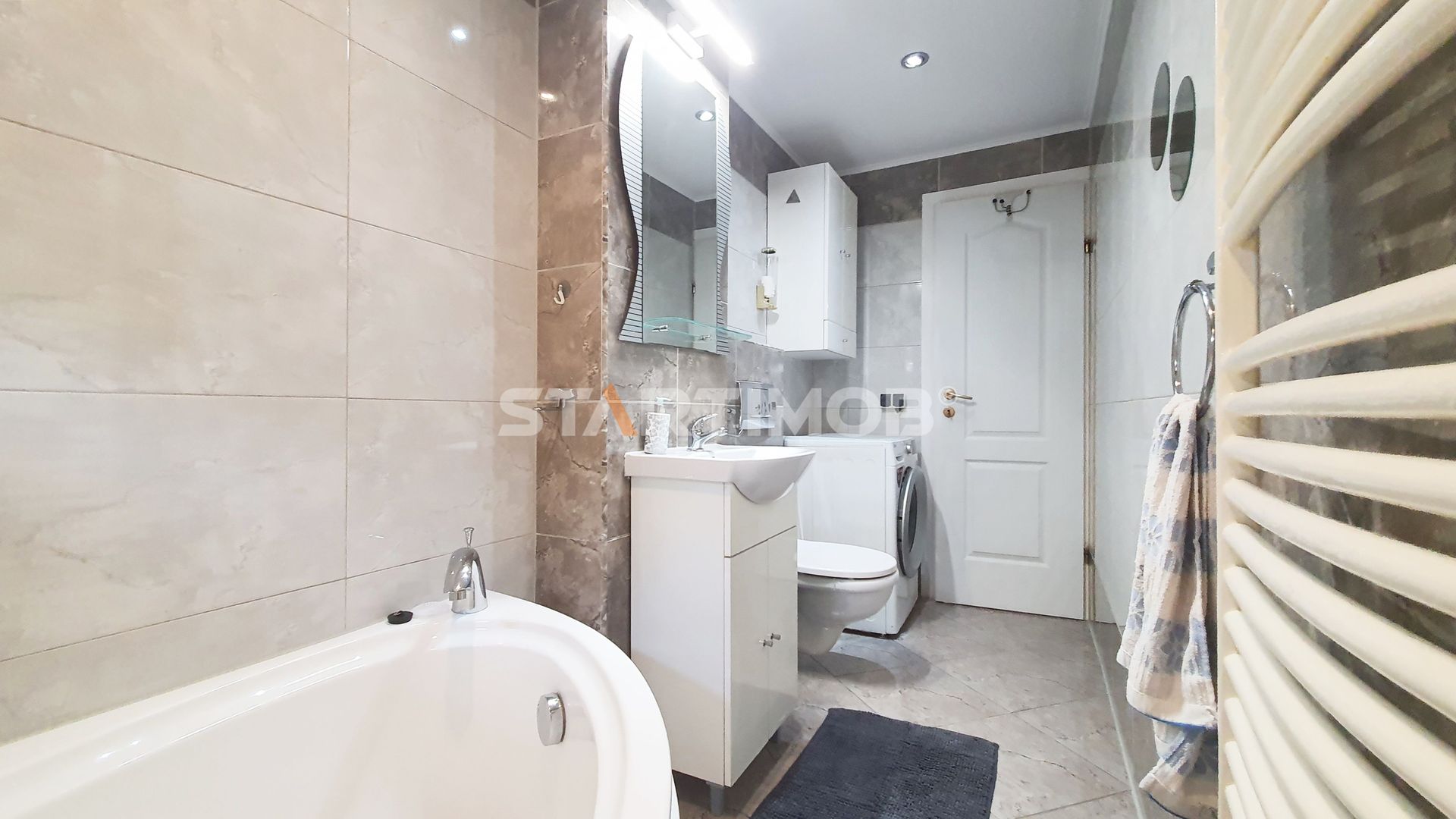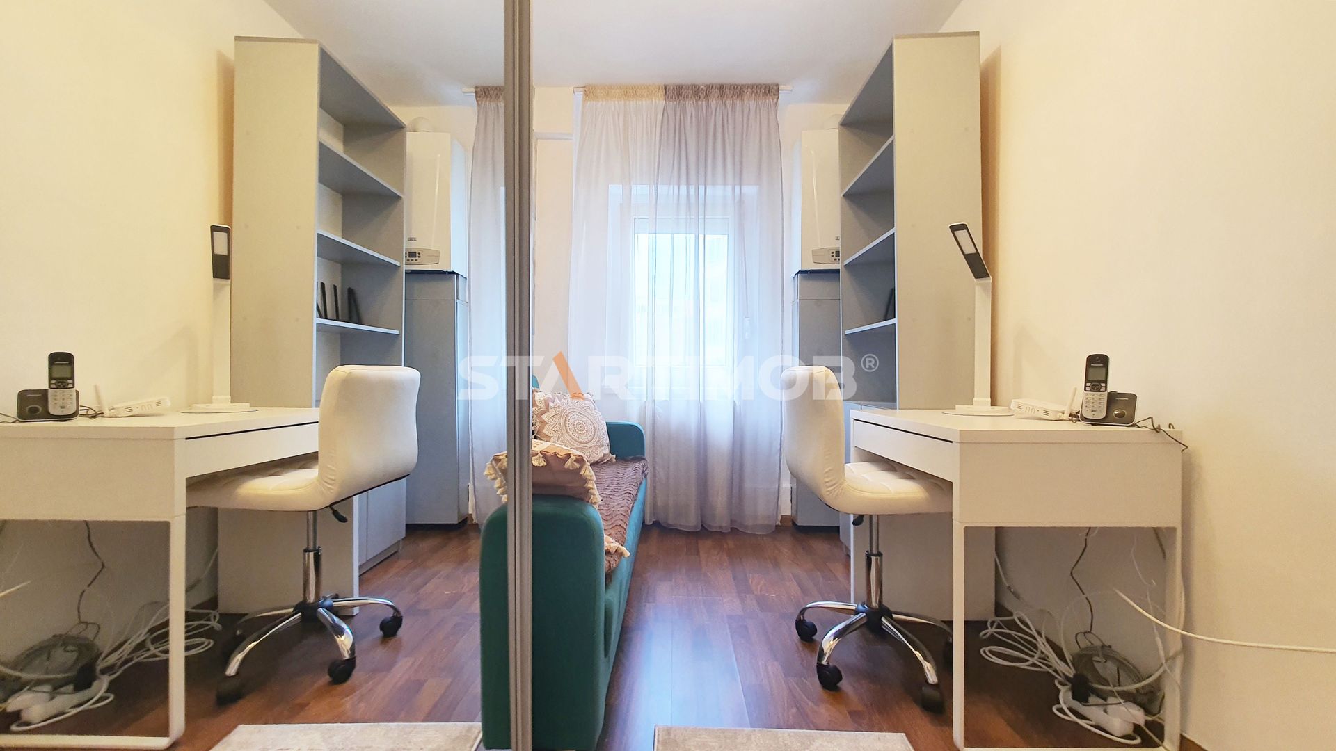 Apartamentul dispune de utilitati separate, incalzire cu centrala termica proprie marca Baxi, tamplarie PVC cu geam termopan, parchet, gresie, faianta, iar printre dotari mentionam bucataria utilata cu plita si cuptor electric, hota electrica marca Electrolux, combina frigorifica marca LG , masina de spalat vase Beko, masina de spalat automata marca Whirlpool , cuptor cu microunde marca Samsung, TV LCD SMART Samsung in living si dormitor si Tv Philips in bucatarie, pat dublu in dormitor, canapea extensibila in living si canapea mica extensibila in birou, dulap tip dressing , etc.