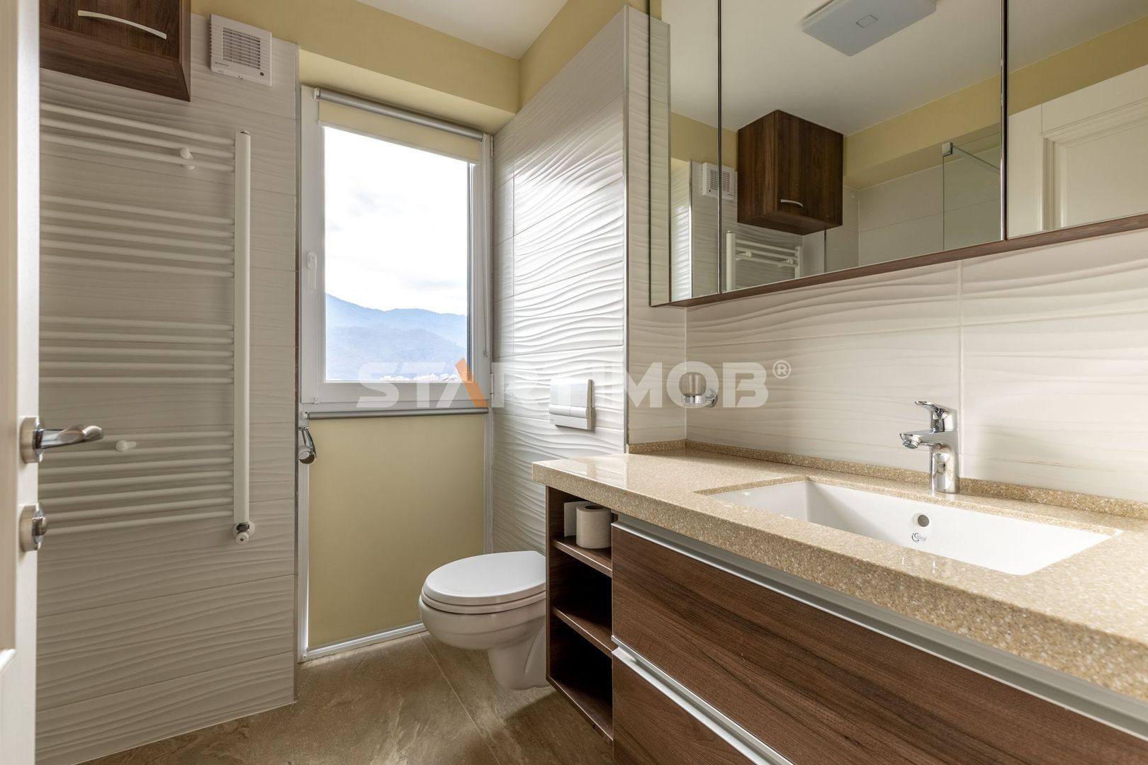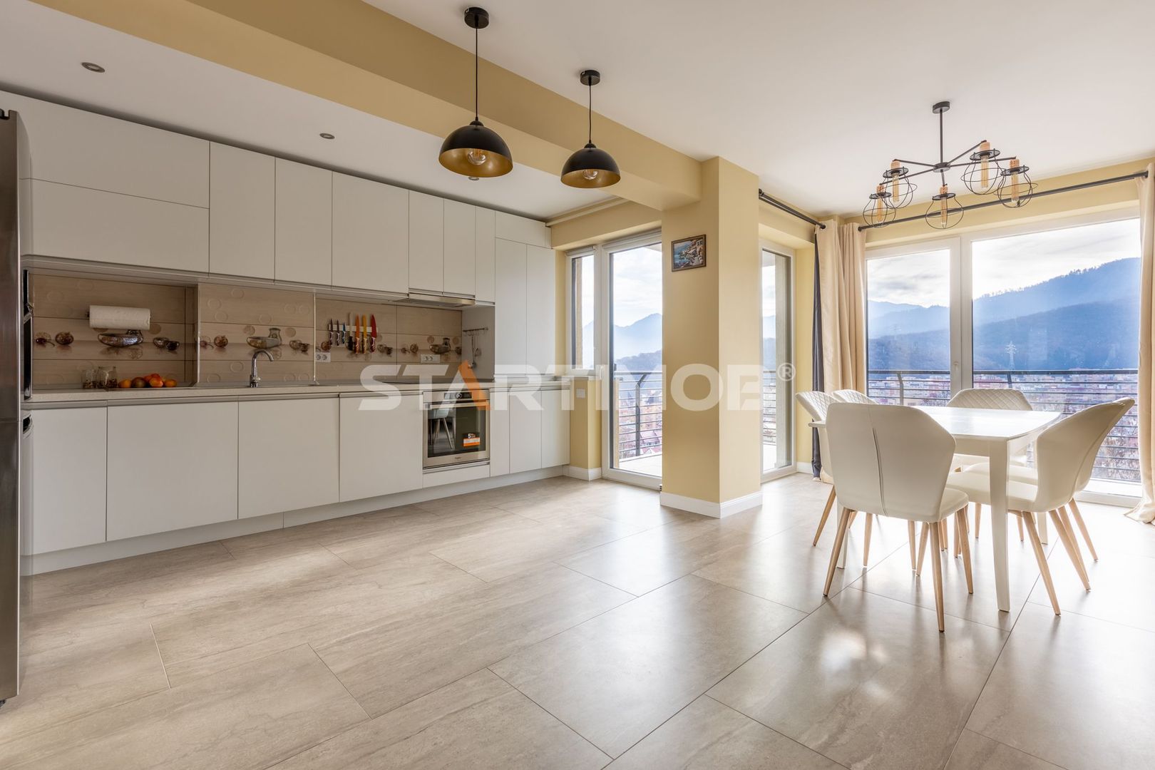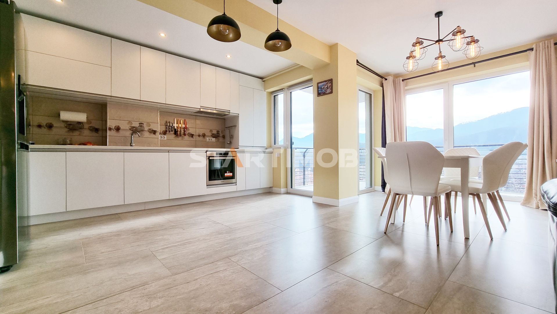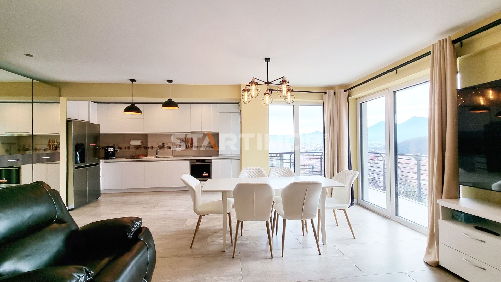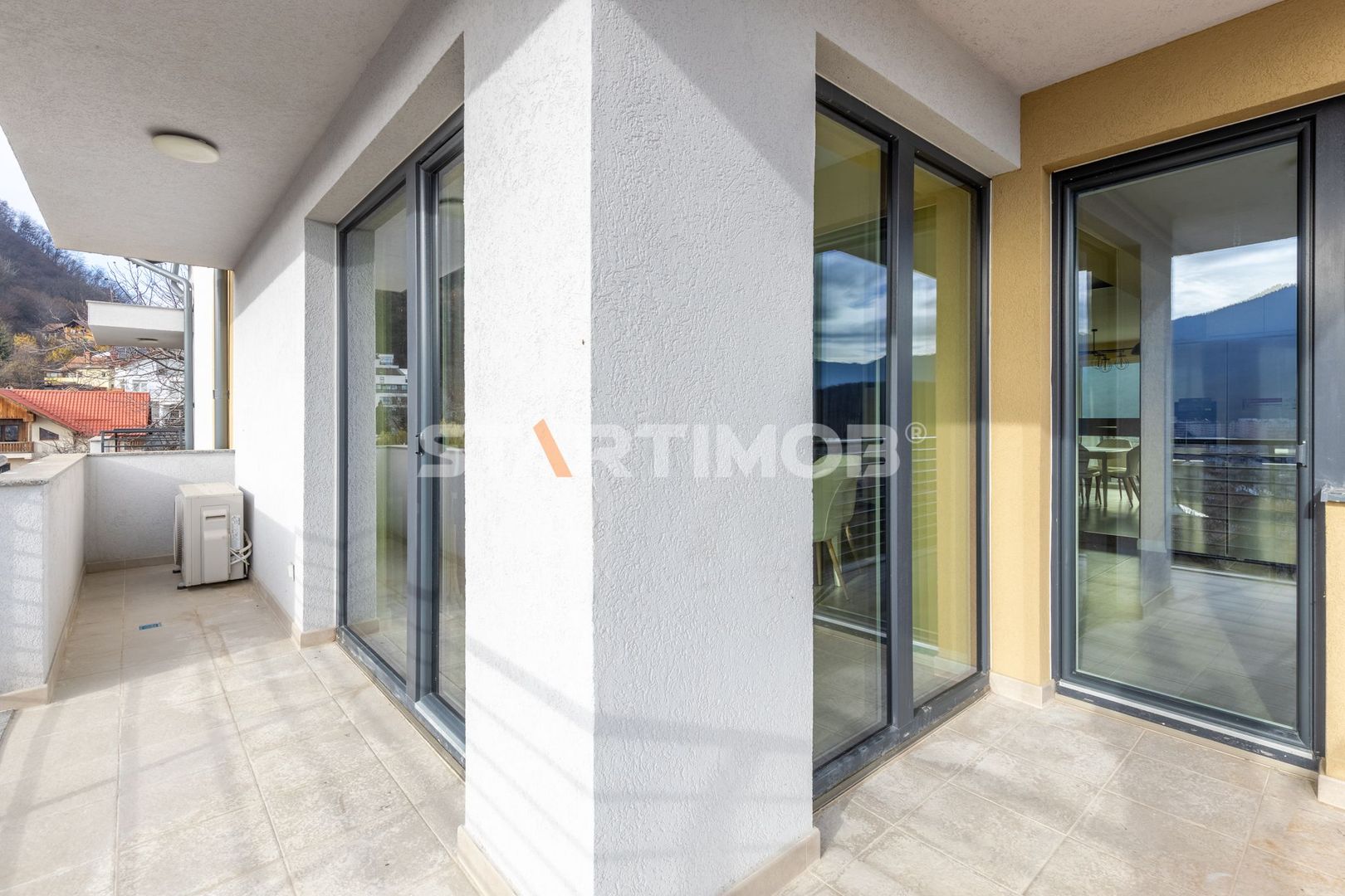 Proprietatea are o suprafata totala de 102 mp si o arie utila de 83 mp fiind compus din hol (11,8 mp), living open space bucataria si dining-ul (30,8 mp) si iesire spre o terasa cu o priveliste deosebita asupra muntilor (9,5 mp), 2 bai de 4,4 mp, respectiv 4,1 mp ( ambele cu cabina de dus), si 2 dormitoare ( 13,15 mp si 13,2 mp) cu acces la o a doua terasa de 9,3 mp si dressing de 4,7 mp.
