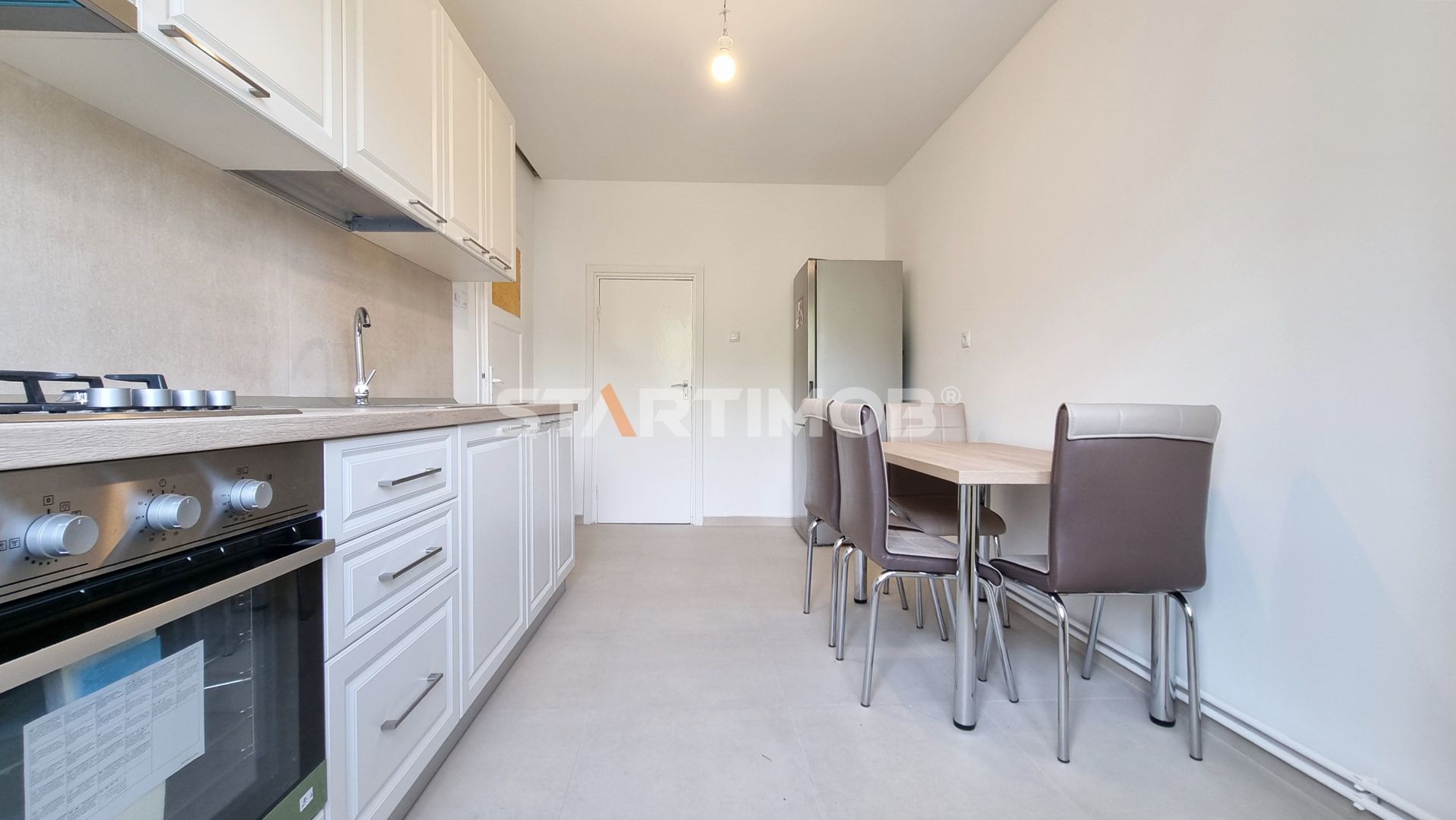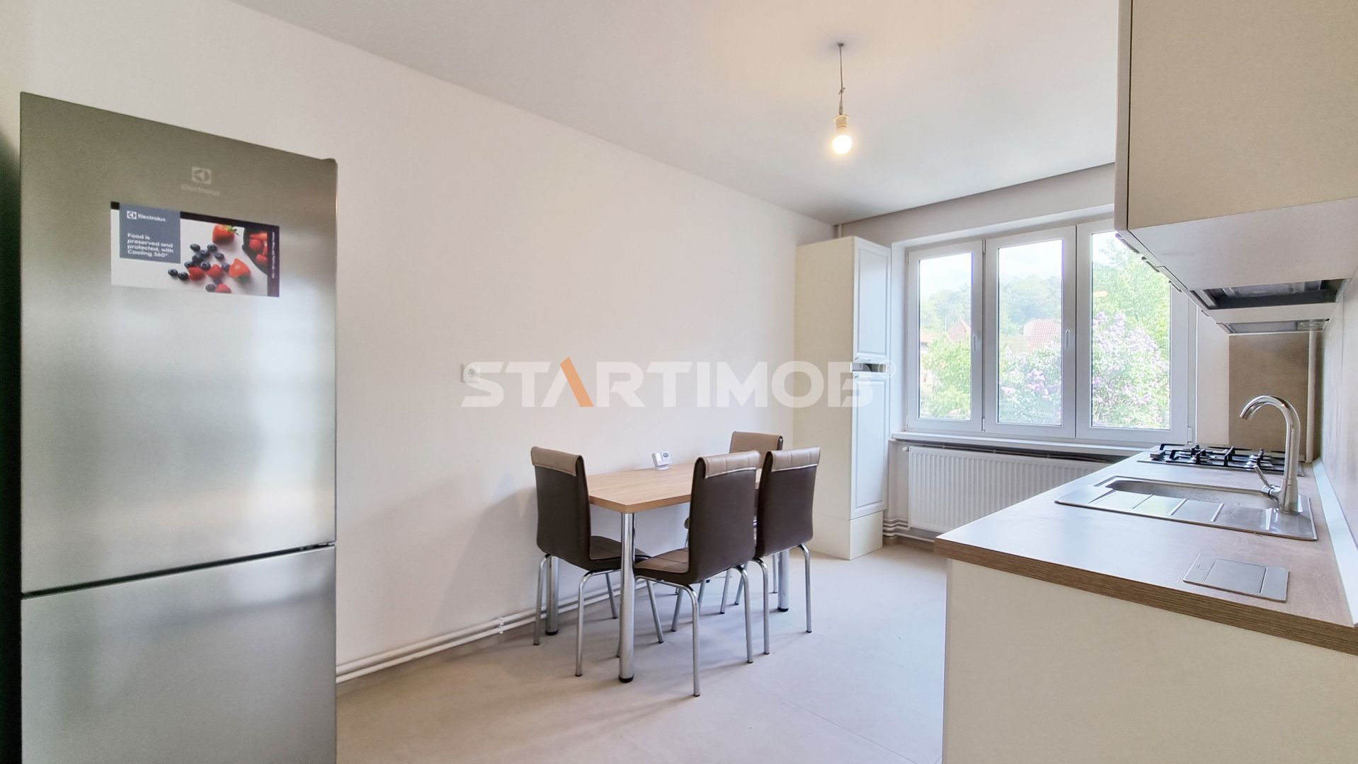 Apartamentul se inchiriaza nemobilat, cu bucataria mobilata si utilata complet, iar printre dotari amintim electrocasnicele marca Electrolux : combina frigorifica, cuptor electric, plita pe gaz si hota electrica, precum si mobilier realizat pe comanda.