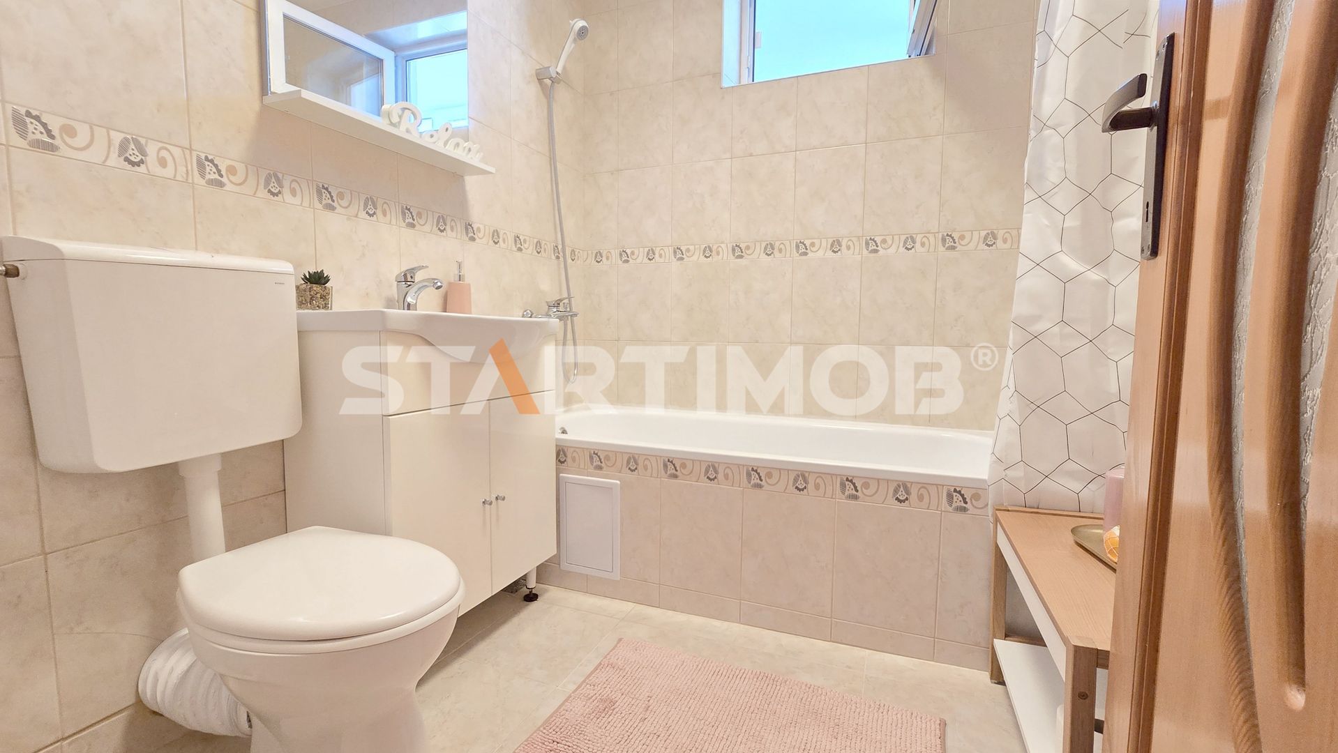 Apartamentul are o suprafata utila de 55 mp, structura semidecomandata, compus din doua camere, doua balcoane, baie cu aerisire, bucatarie, hol, mobilat si utilat complet, centrala termica proprie, tamplarie termopan, masina de spalat automata, TV , Aer Conditionat.