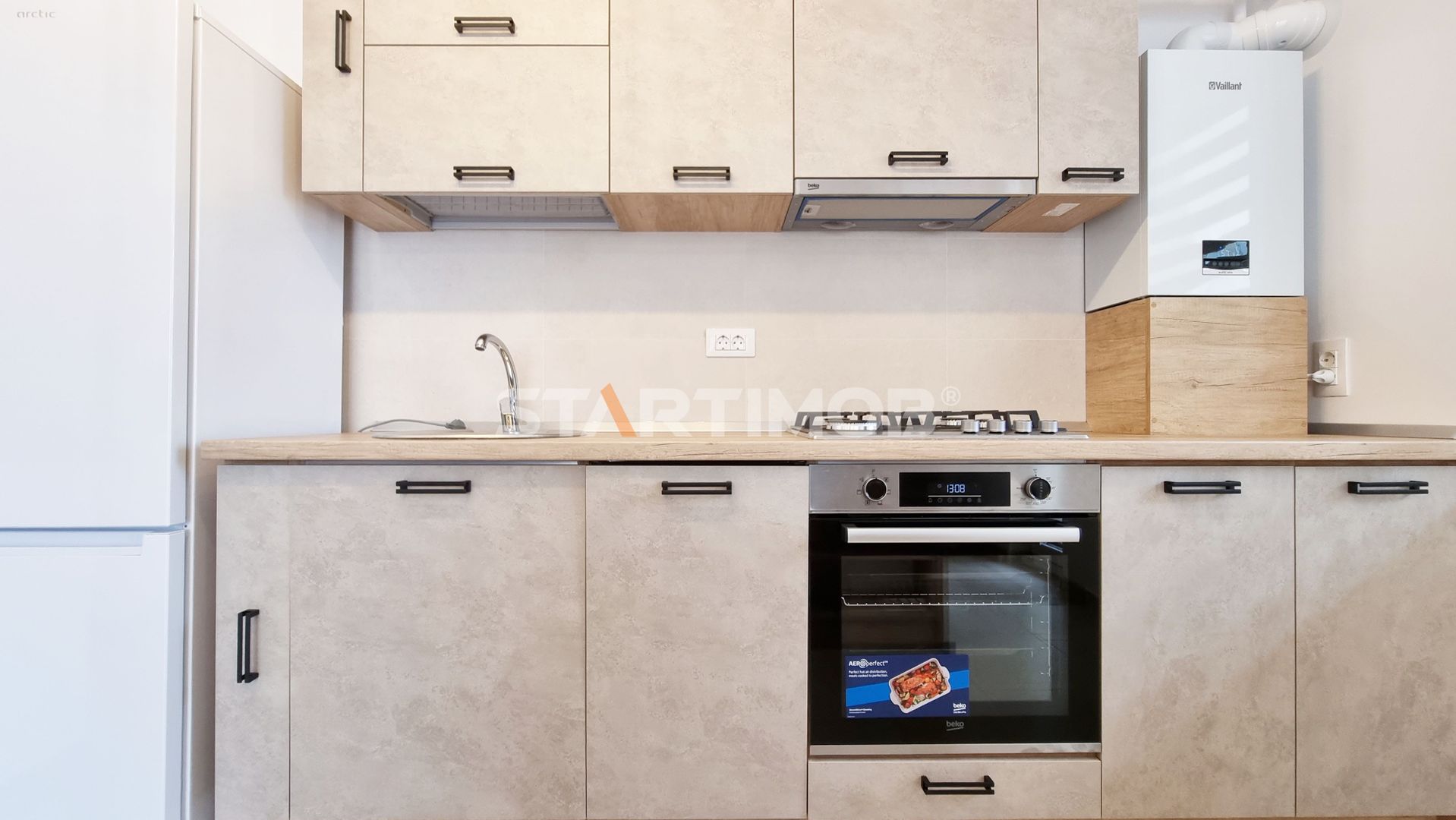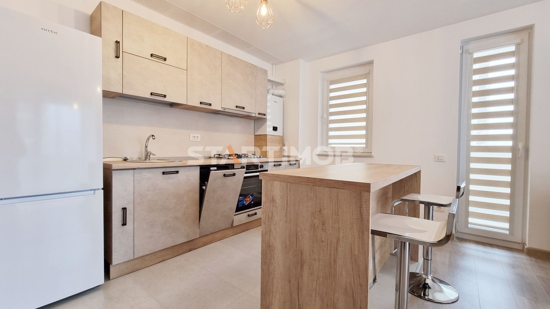 Dotarile apartamentului sunt : mobilier realizat pe comanda, dressing, bucatarie dotata si echipata complet ( plita pe gaz, cuptor electric si hota marca Beko, combina frigorifica Arctic), baie complet mobilata si utilata, inclusiv cu masina de spalat automata.