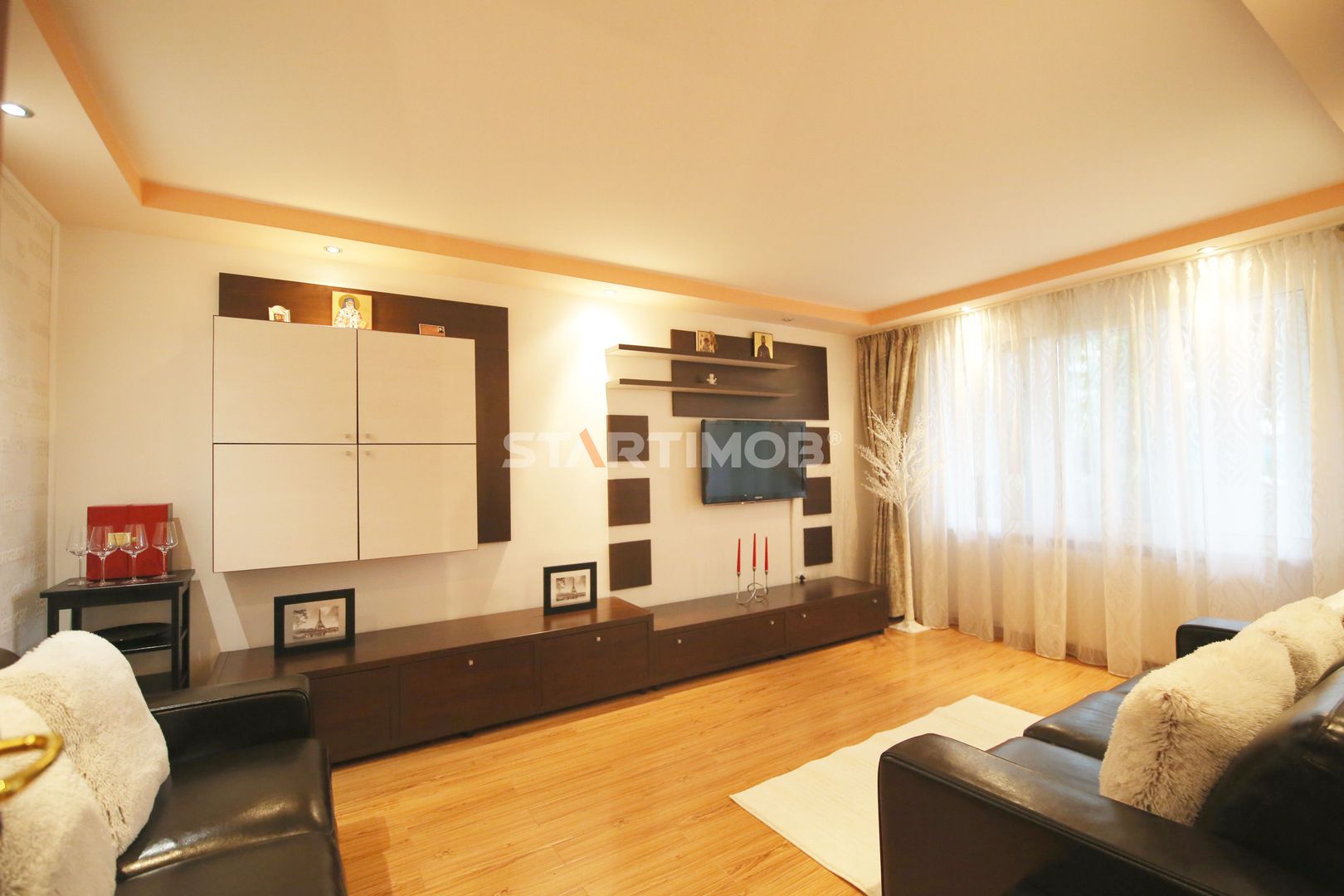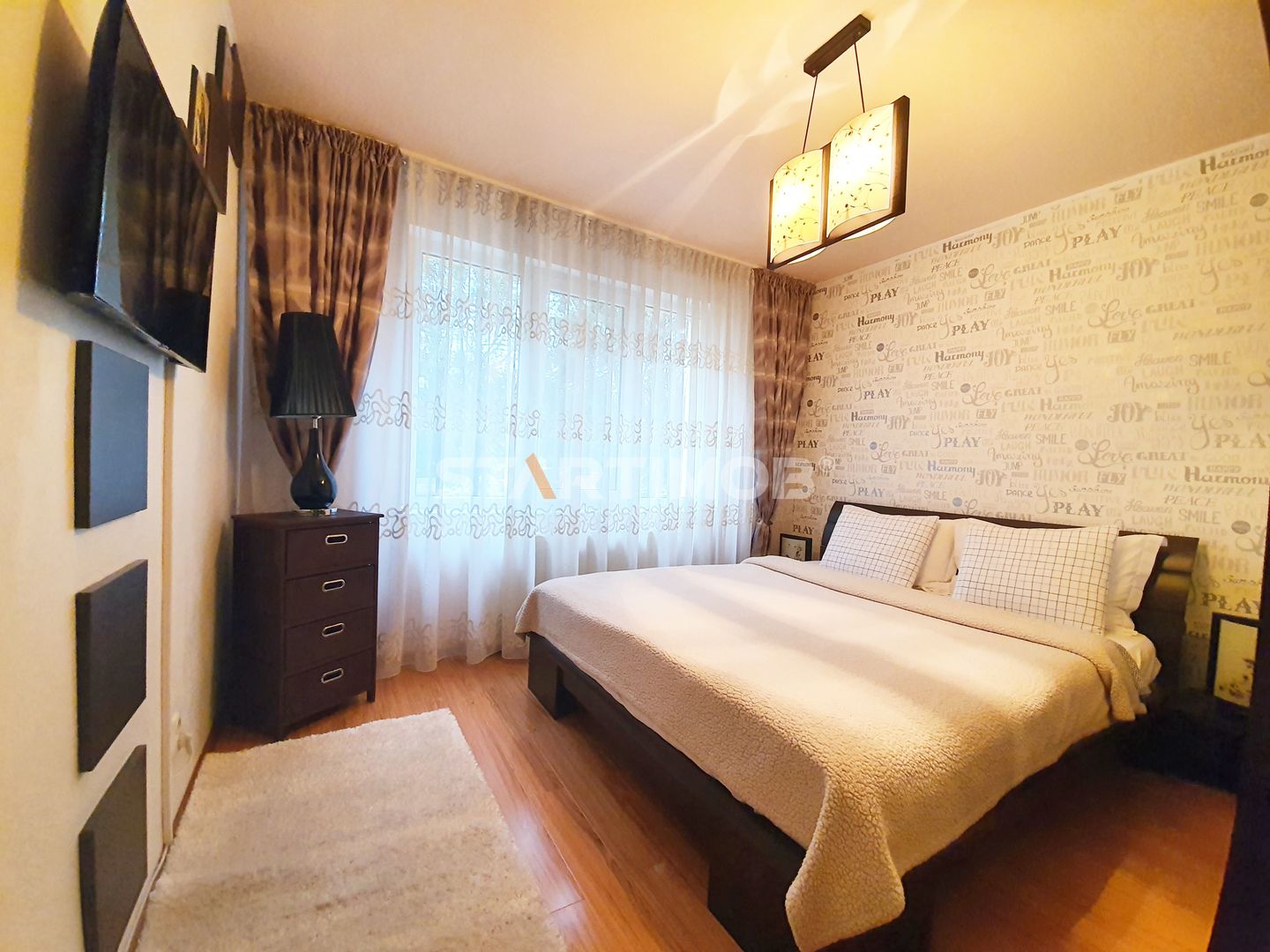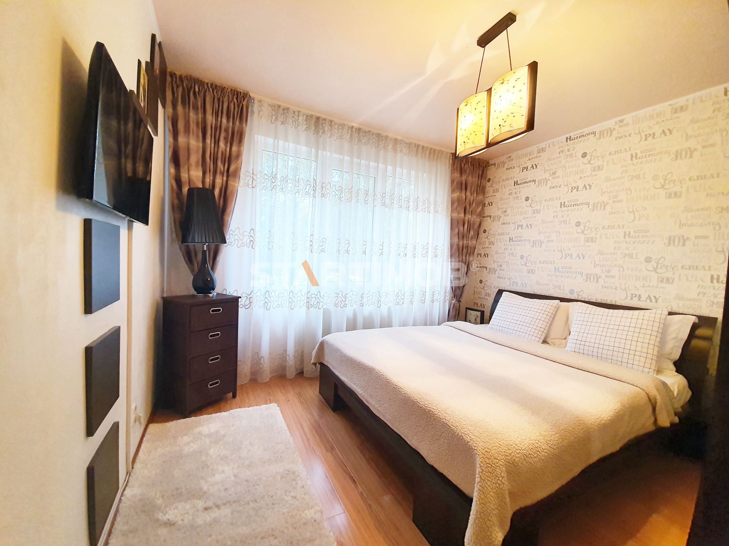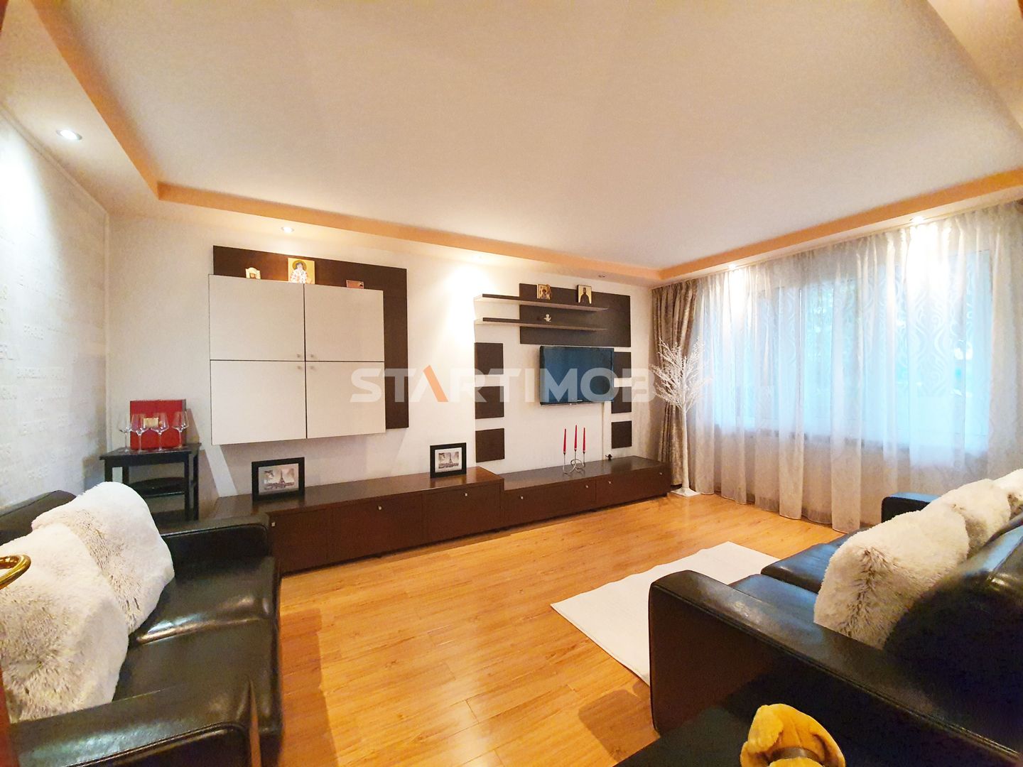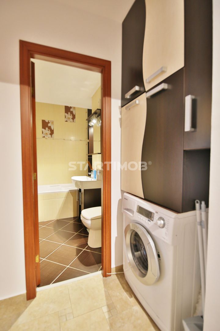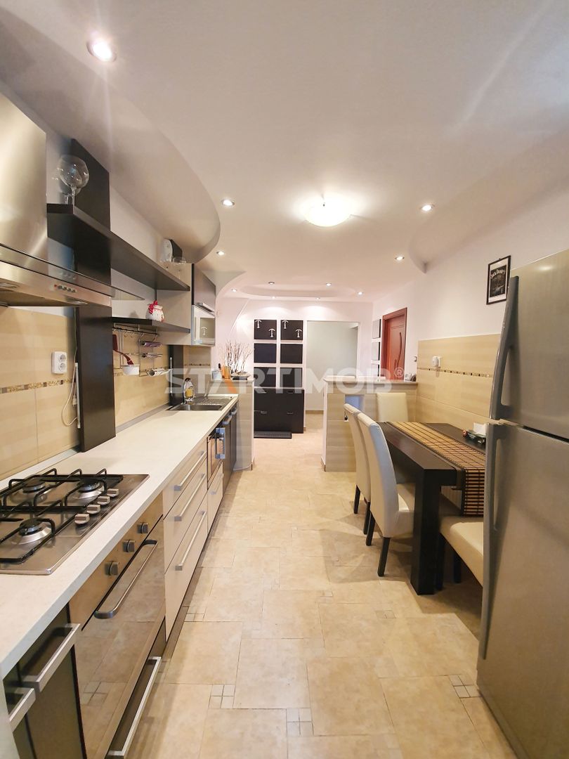 Apartamentul este complet mobilat si utilat, fiecare camera dispune de TV, conexiune cablu si internet in derulare si router wireless, centrala termica proprie, parchet, tamplarie PVC cu geam termopan, masina de spalat automata, bucatarie mobilata complet si echipata cu electrocasnice precum combina frigorifica, cuptor electric si plita pe gaz, hota electrica si cuptor cu microunde- linie Franke .