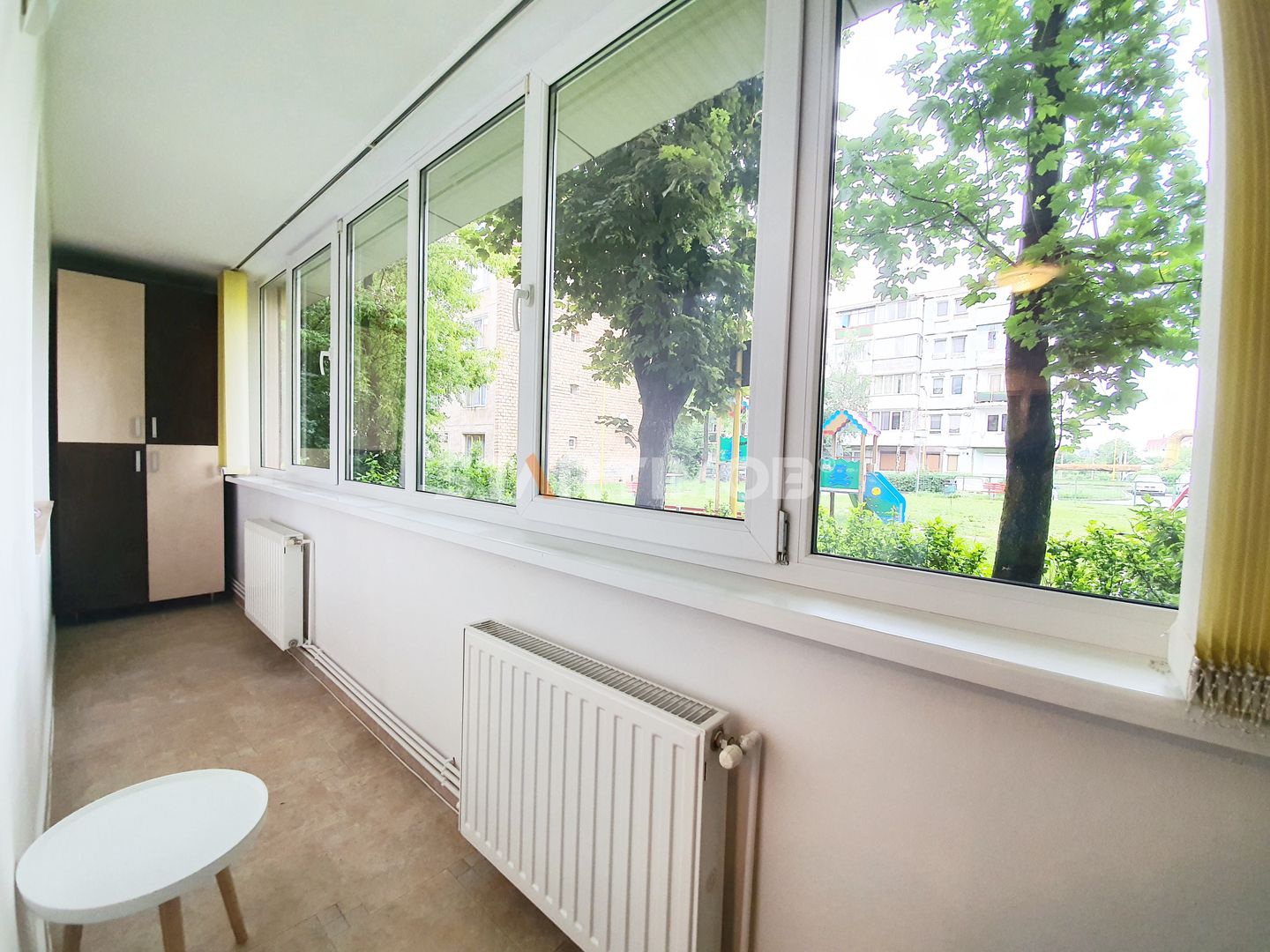Apartamentul este situat la parterul unui bloc , anvelopat termic, are o suprafata de 55 mp, structura decomandata fiind compus din 2 camere, hol, baie, bucatarie, balcon inchis in termopan, birou si debara.