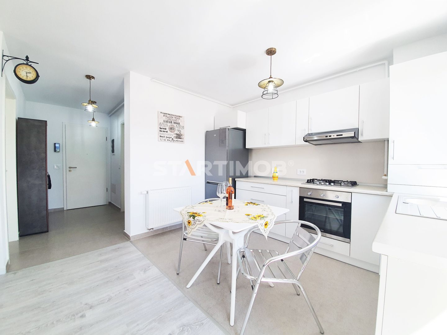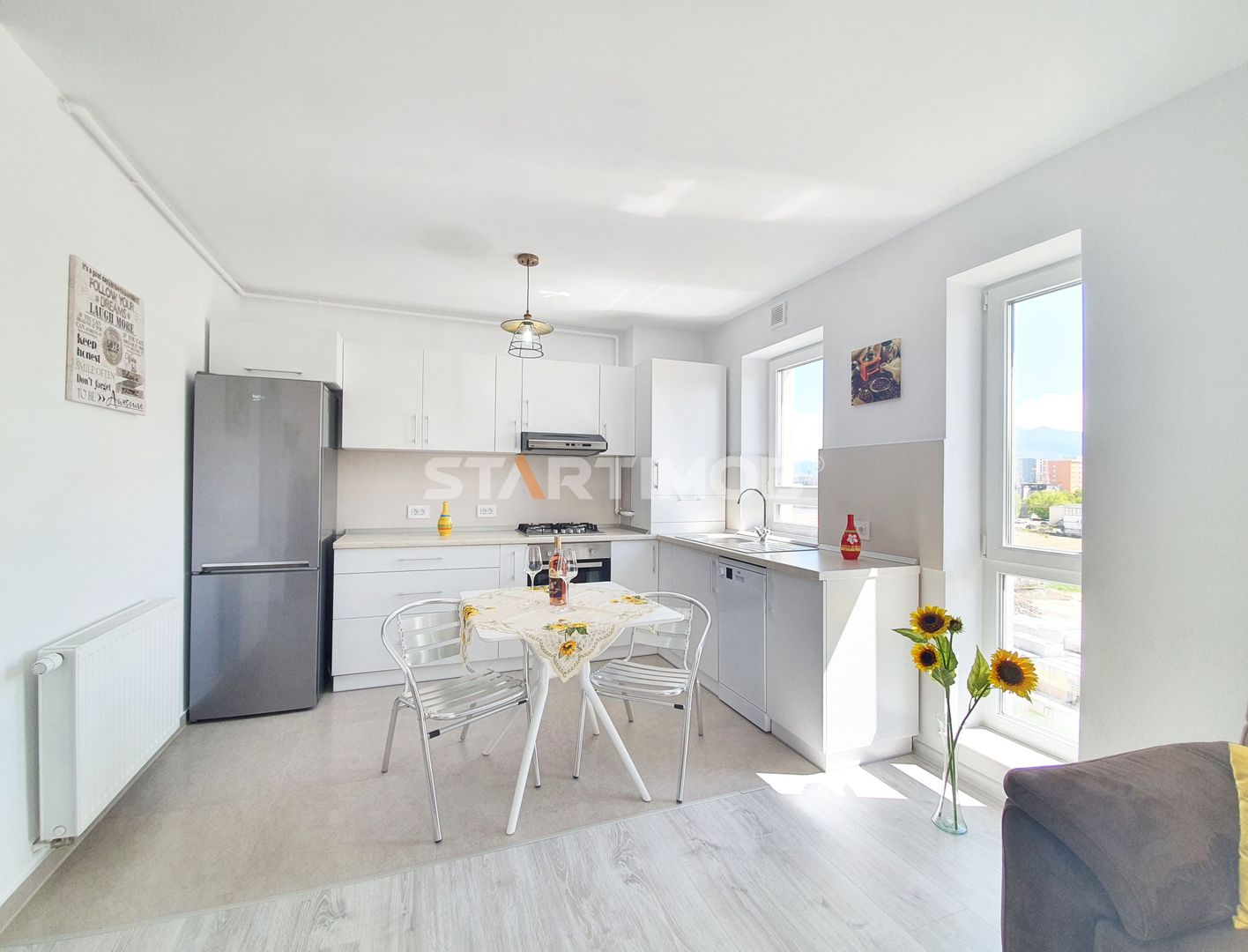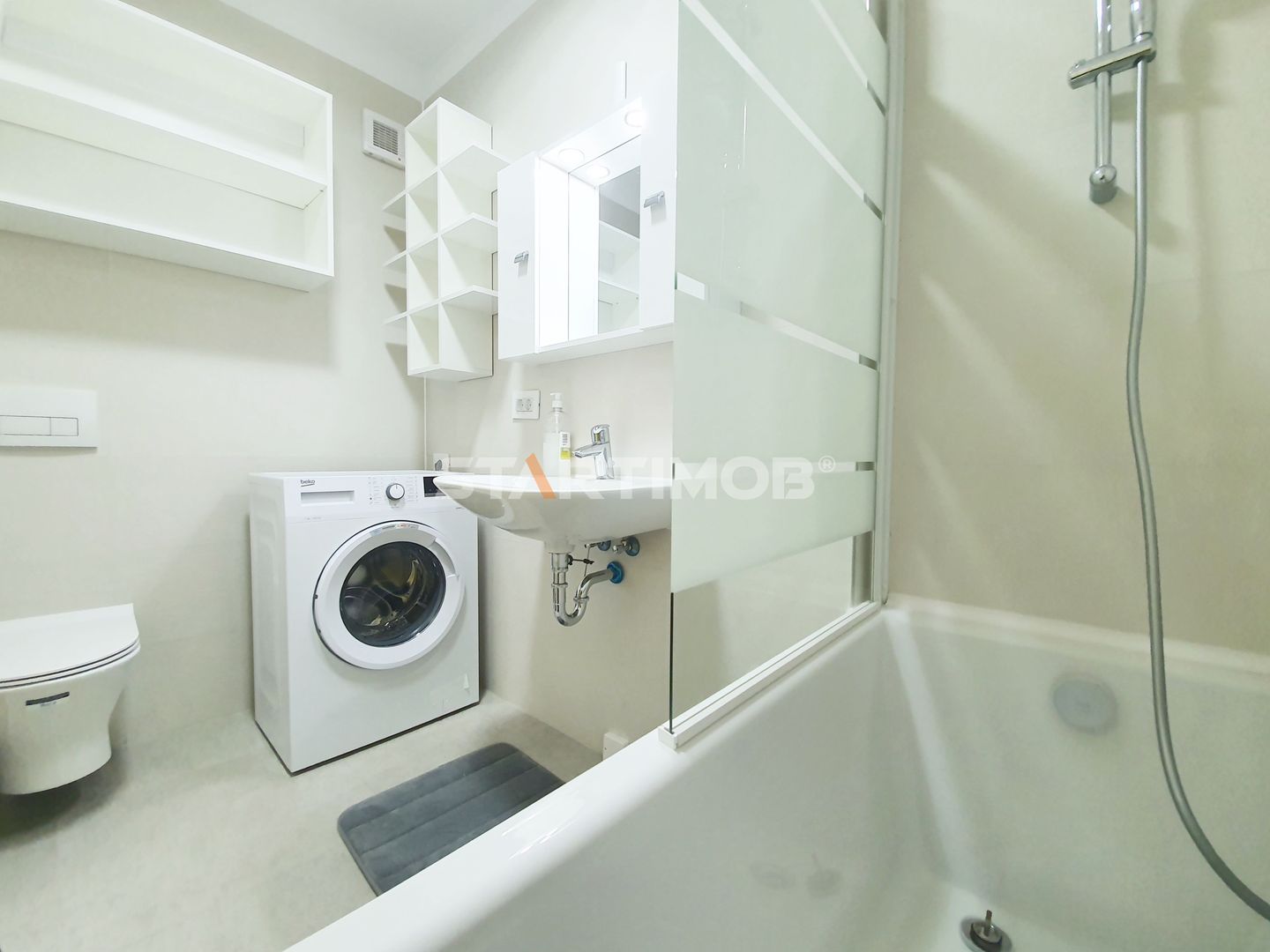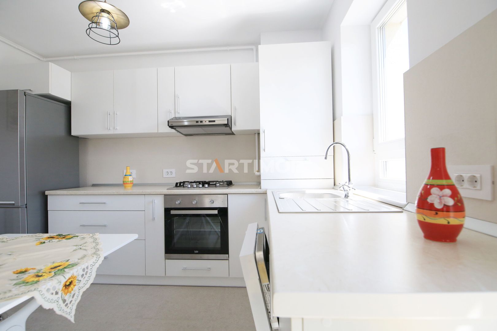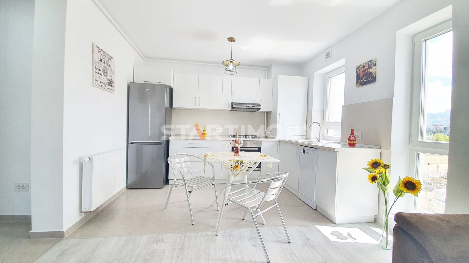 Dotarile apartamentului sunt : mobilier realizat pe comanda, linie de bucatarie BEKO, dotata si echipata complet cu electrocasnice de calitate: aragaz, hota, cuptor electric, combina frigorifica, masina de spalat vase, masina de spalat automata, baie complet mobilata si utilata, televizor smart.