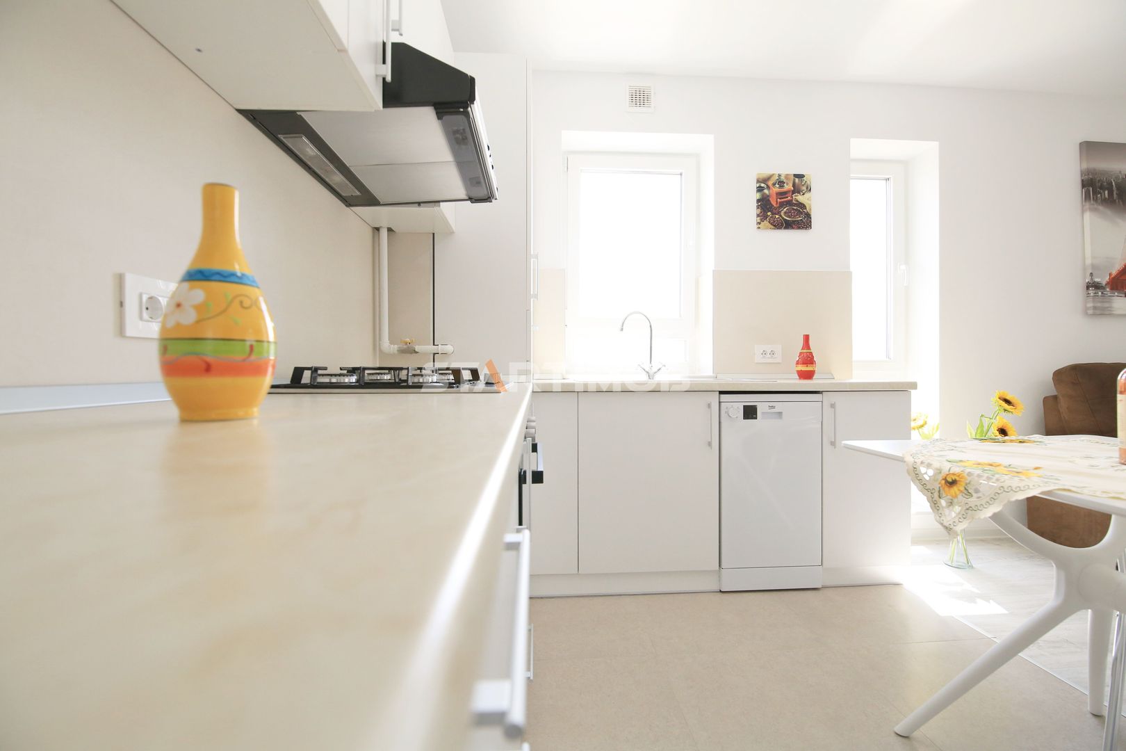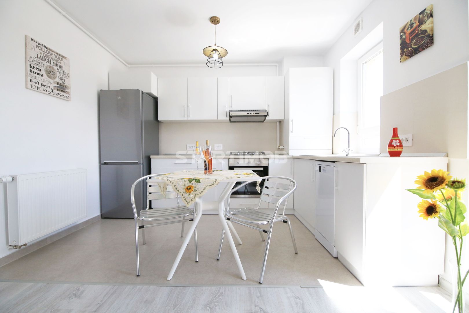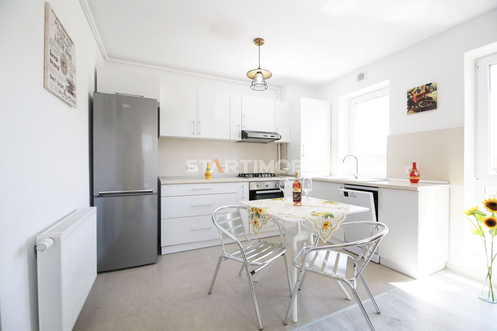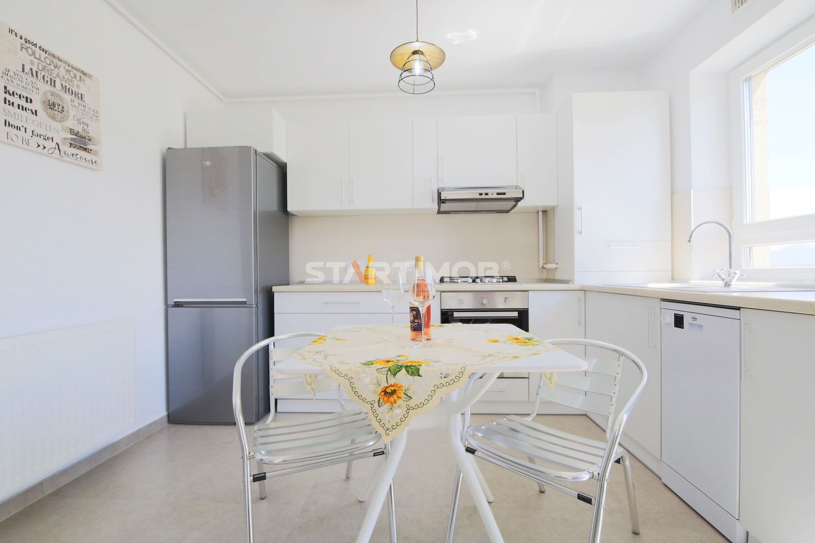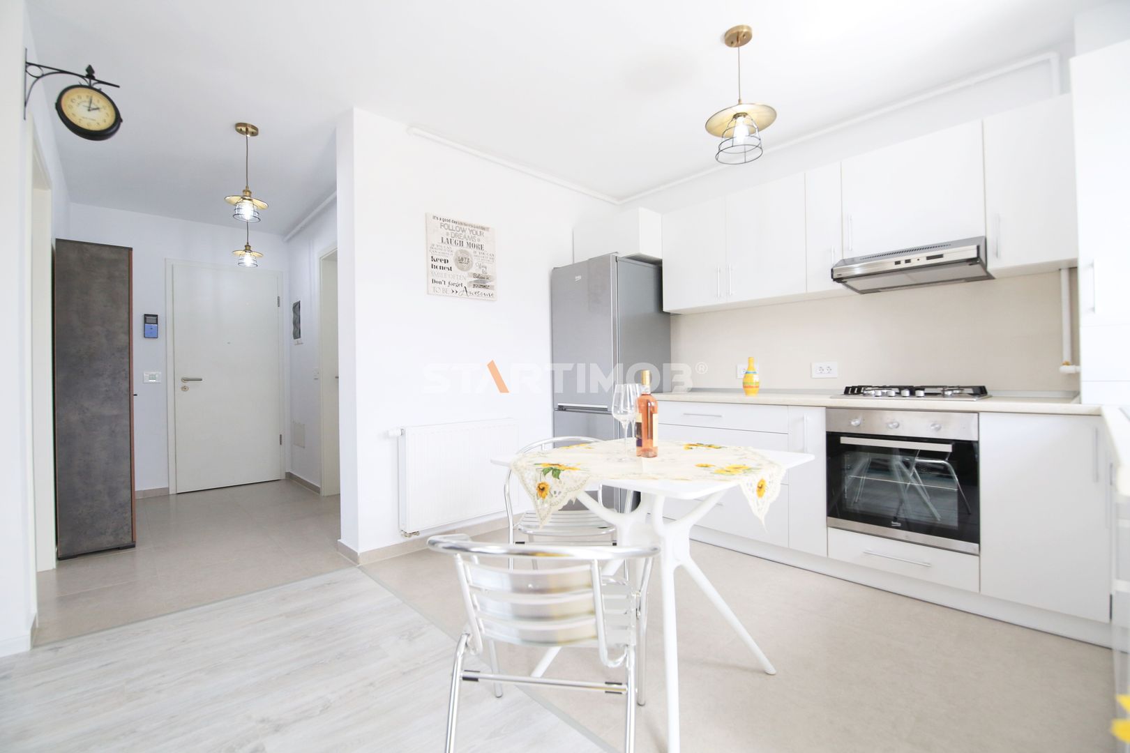 Dotarile apartamentului sunt : mobilier realizat pe comanda, linie de bucatarie BEKO, dotata si echipata complet cu electrocasnice de calitate: aragaz, hota, cuptor electric, combina frigorifica, masina de spalat vase, masina de spalat automata, baie complet mobilata si utilata, televizor smart.