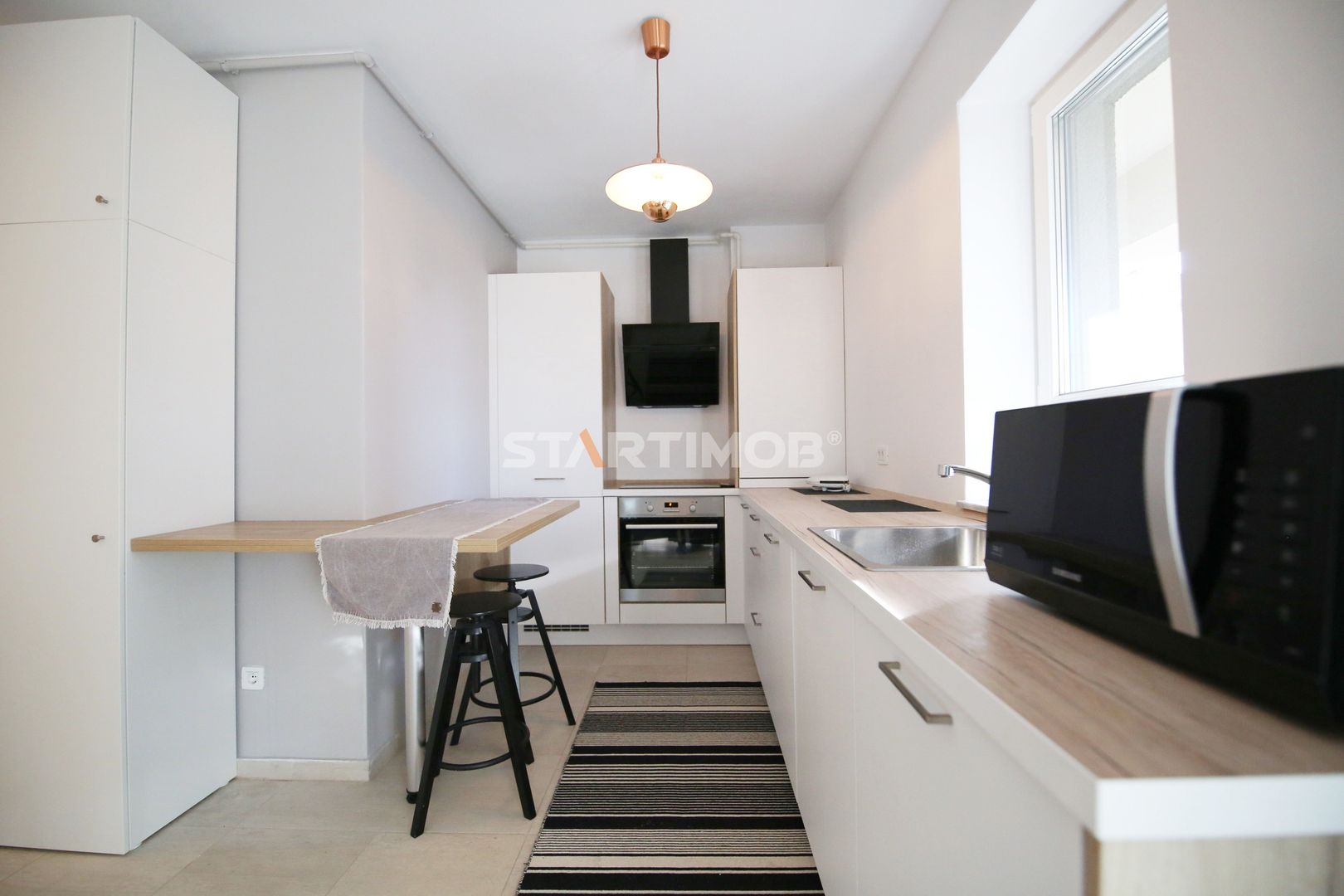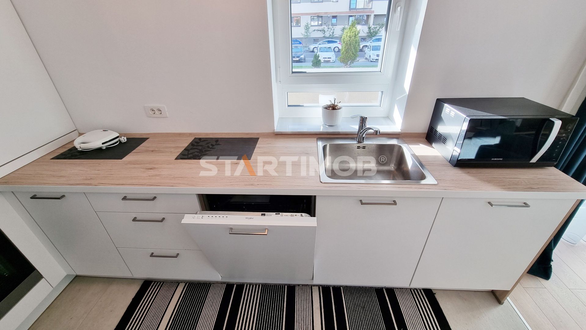 Dotarile apartamentului sunt: mobilier realizat pe comanda, canapea coltar extensibil, pat dormitor cu saltea ortopedica, bucatarie dotata si echipata complet cu electrocasnice de calitate: aragaz, hota, cuptor electric, combina frigorifica, masina de spalat vase, baie complet mobilata si utilata inclusiv cu masina de spalat automata Whirlpool, televizor smart in living.