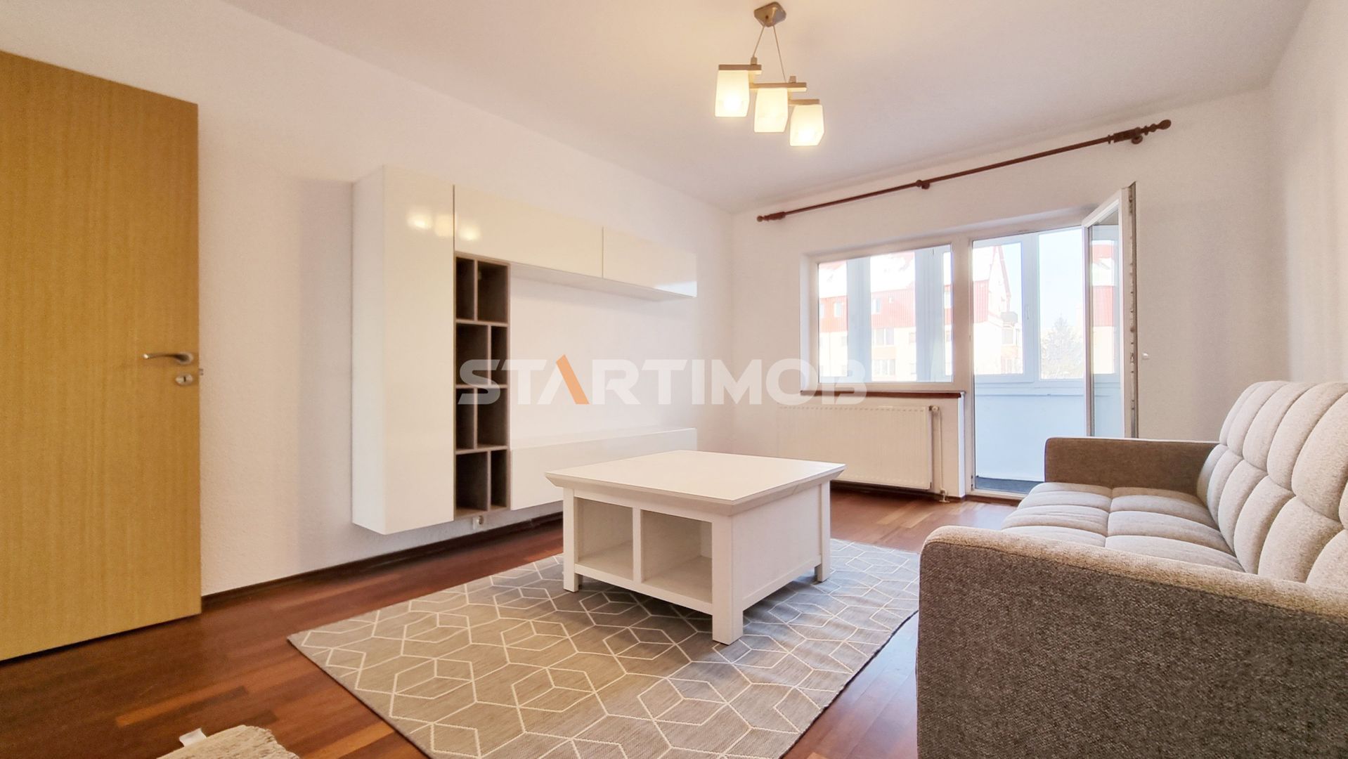 Apartamentul are o arie utila de 51 mp si o suprafata totala de 54 mp, cu structura decomandata fiind compus din living cu balcon inchis in termopan, dormitor, baie, hol, debara si bucatarie.