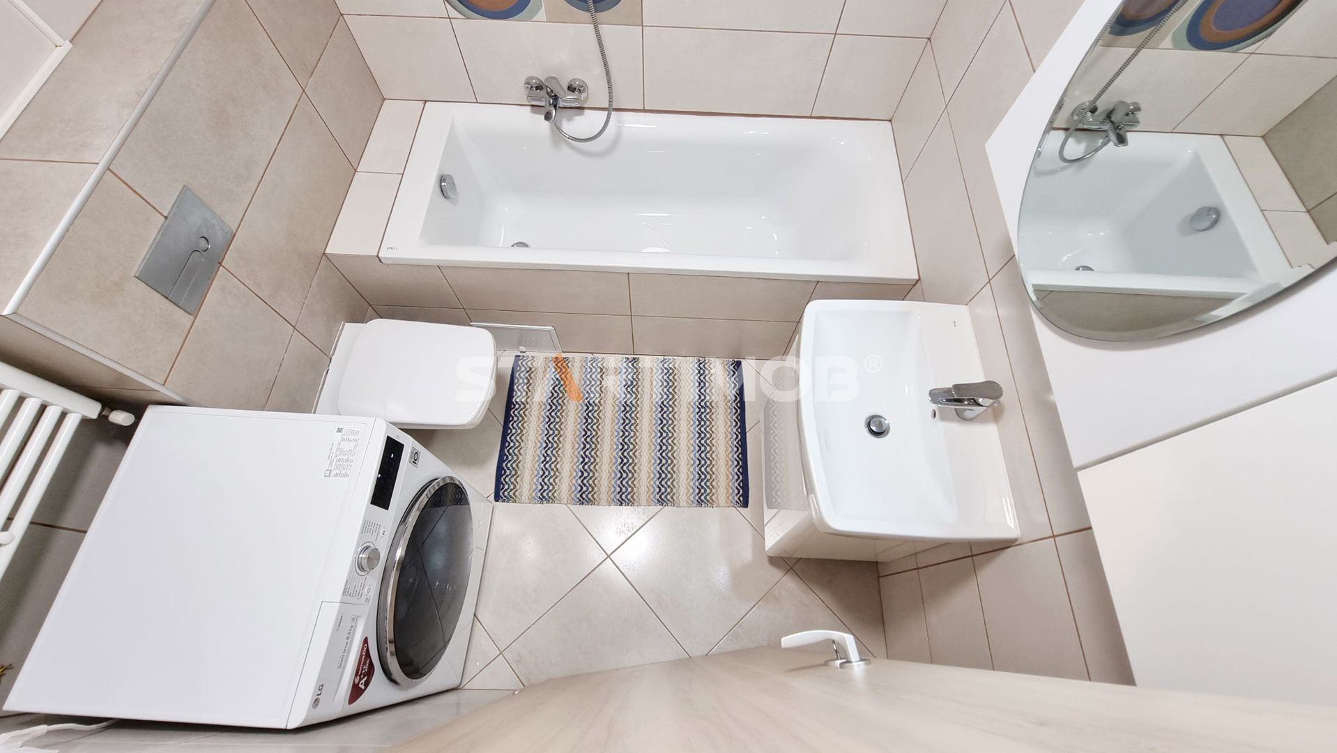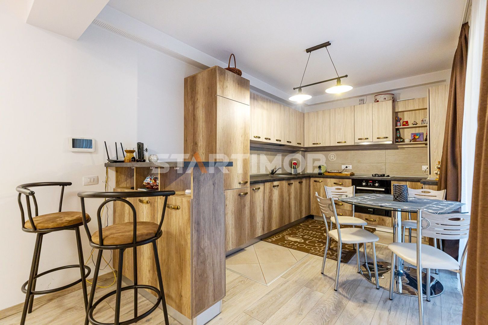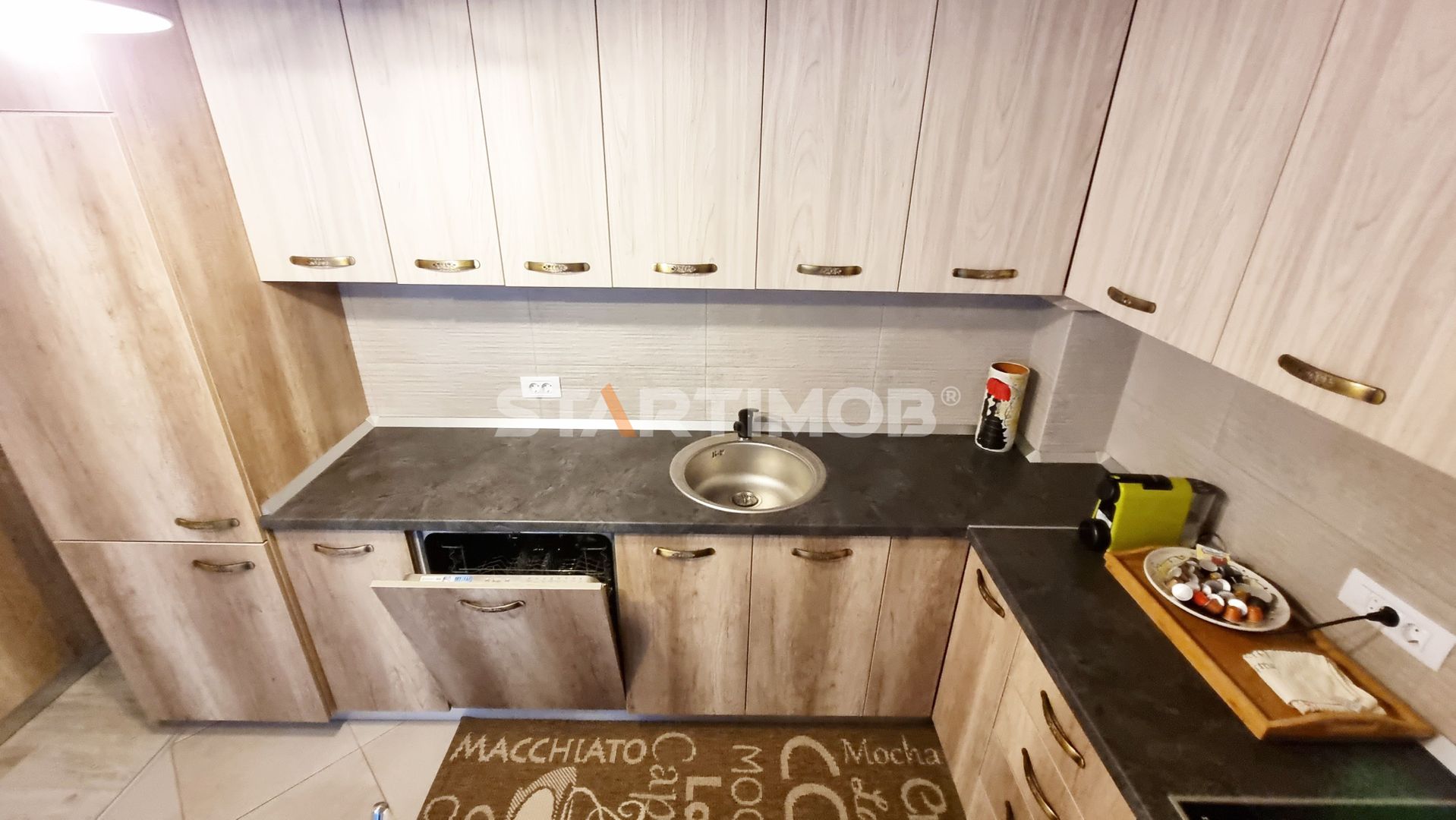 Printre dotarile apartamentului mentionam mobilier realizat pe comanda, dressing si pat dublu in dormitor, bucatarie dotata si echipata complet ( plita Hansa si cuptor electric marca Bosch, hota electrica Gorenje, combina frigorifica Electrolux, masina de spalat vase Electrolux), baie complet mobilata si utilata, inclusiv cu masina de spalat automata LG.