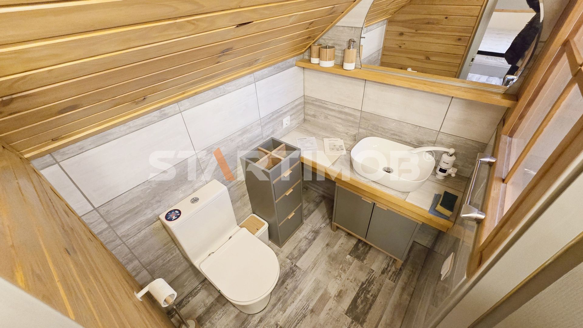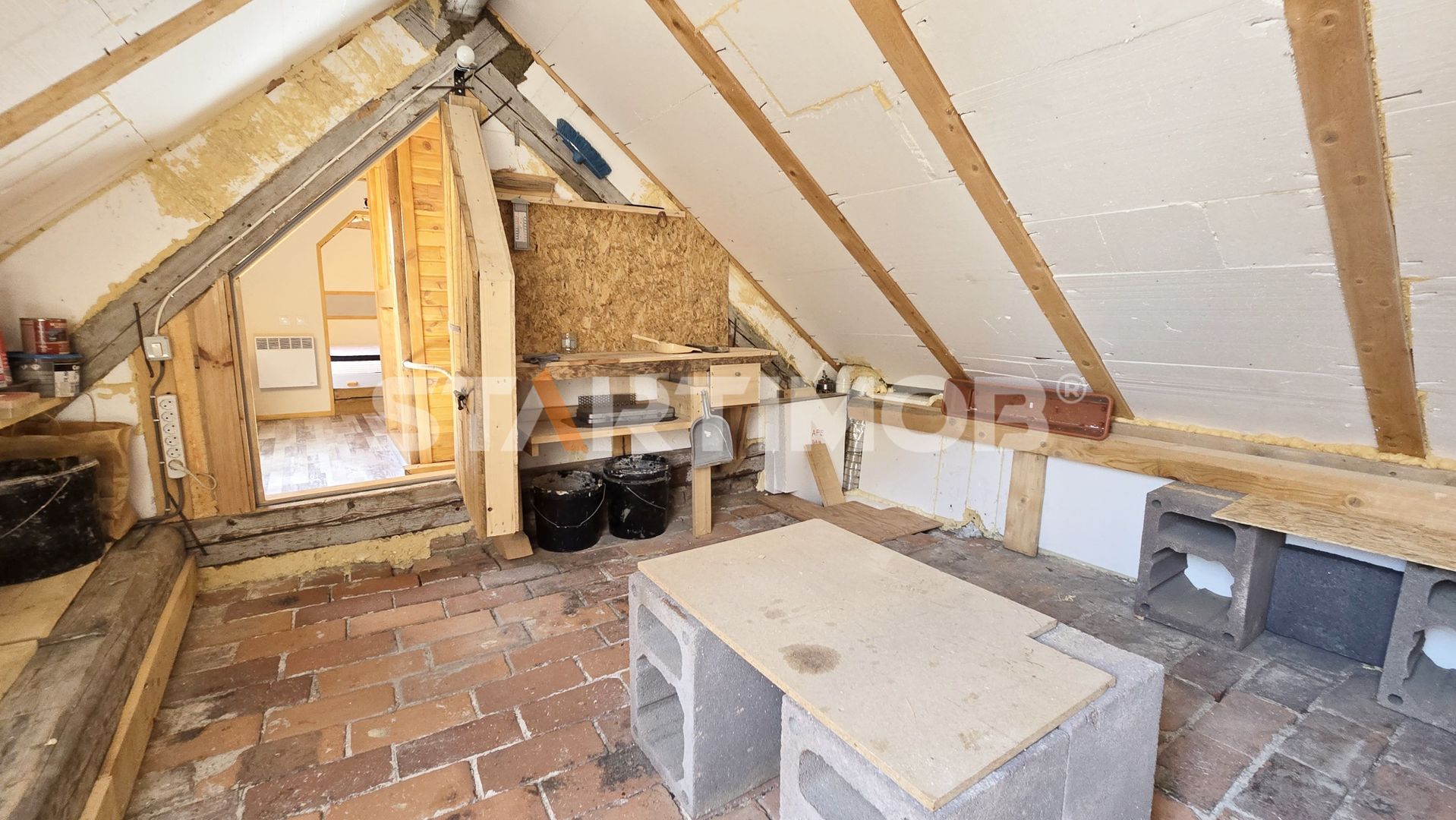 Parter: un living spațios și luminos, pentru relaxare și socializare, bucătărie mobilată și utilată complet, baie cu duș și aerisire naturala, dormitor matrimonial, hol și scara interioara care conduc spre mansarda unde regasim un dormitor luminos, o baie si un mic atelier, care poate fi transformat intr-o zona de relaxare.