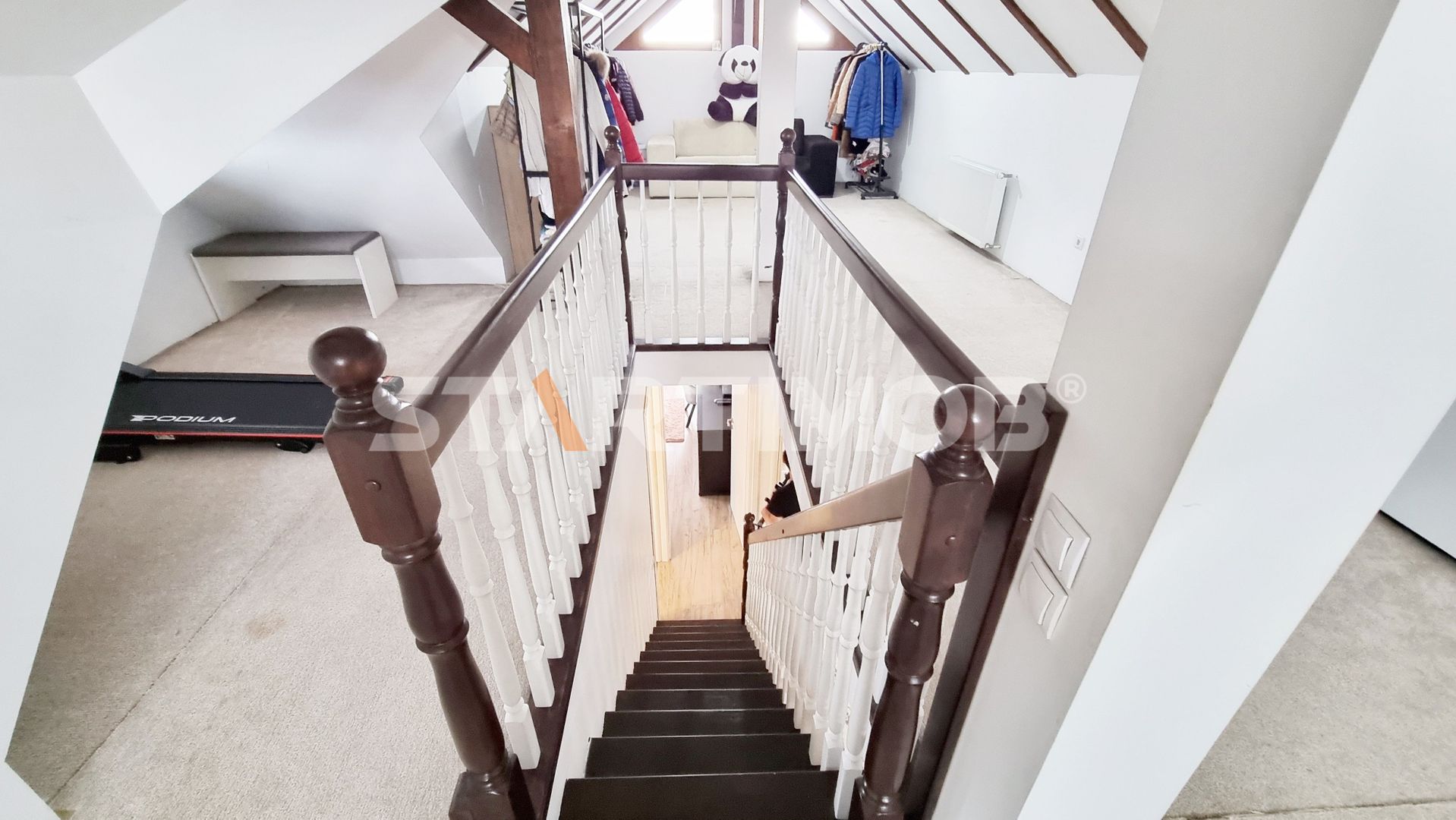 Podul este mansardat, amenajat, mochetat si incalzit , foarte util si functional ca hobby room si prezinta multe spatii adiacente pentru depozitare iar curtea este amenajata cu pavele, dispune de terasa acoperita si foisor cu barbeque, arbusti si pomi ornamentali.