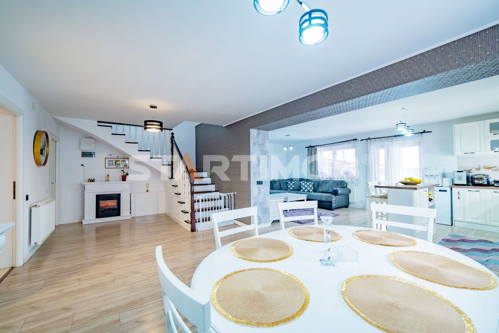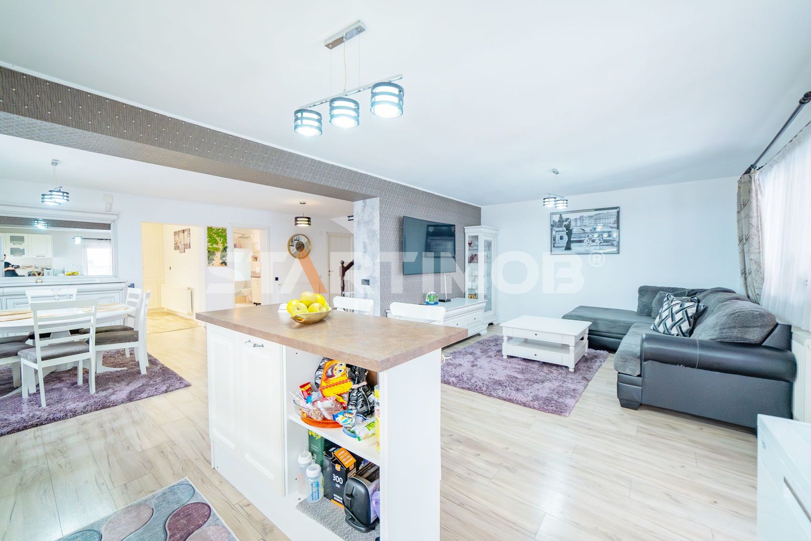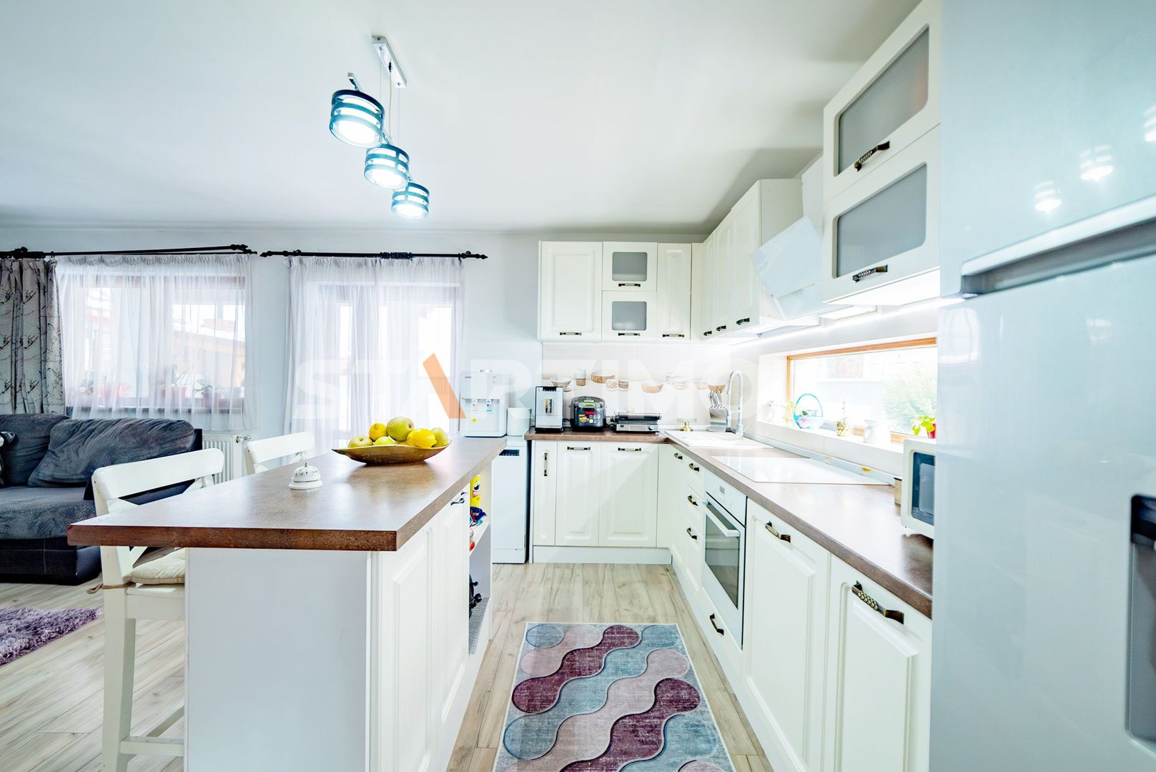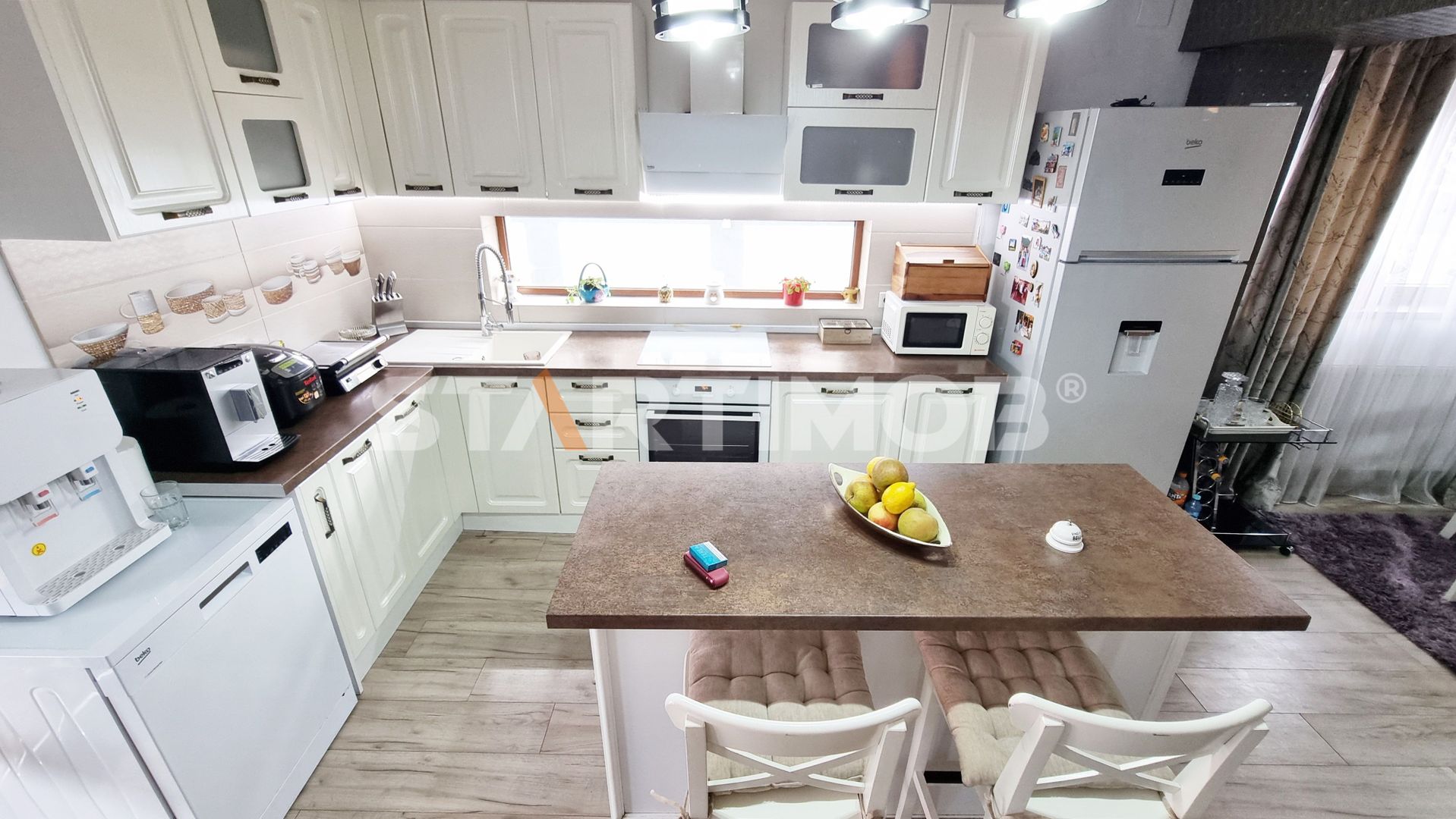 Imobilul se inchiriaza utilat si mobilat complet cu bucataria dotata cu masa tip insula si electrocasnice precum cuptor electric Electrolux, plita pe inductie Gorenje, hota electrica si masina de spalat vase 60 cm marca Beko, combina frigorifica Beko Water Dispenser, masina de spalat automata marca Samsung si TV LCD Smart Samsung in living si dormitoare, filtru de apa, system de alarma, etc