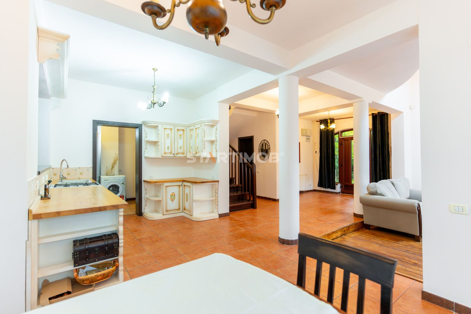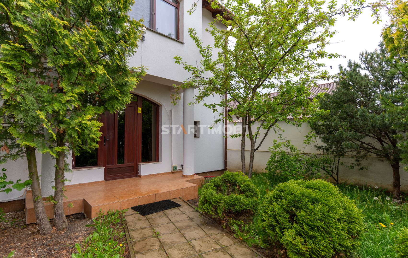 Accesul in casa propusa spre inchiriere se realizeaza printr-un ancadrament decorativ special, apoi din holul parterului putem accesa toate incaperile de pe nivel ( living-ul, bucataria si dining-ul cu acces spre terasa exterioara, camera tehnica a centralei si grupul sanitar, plus scara ce conduce spre etaj).