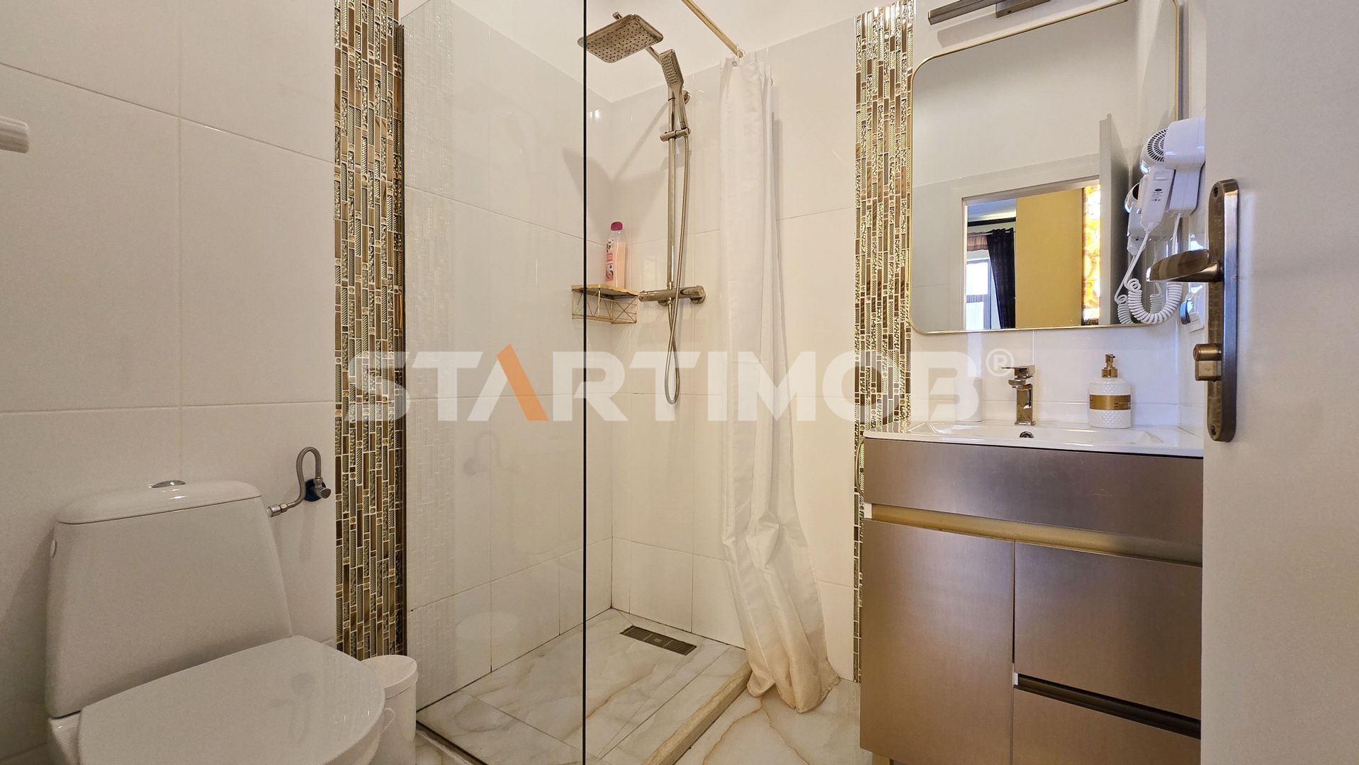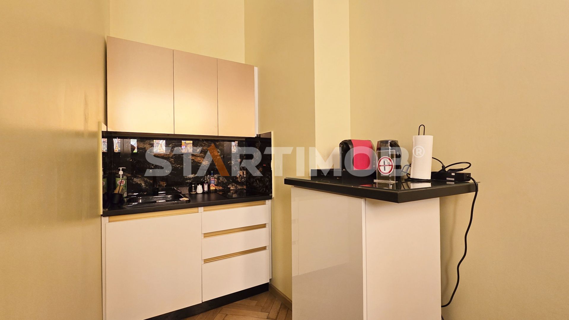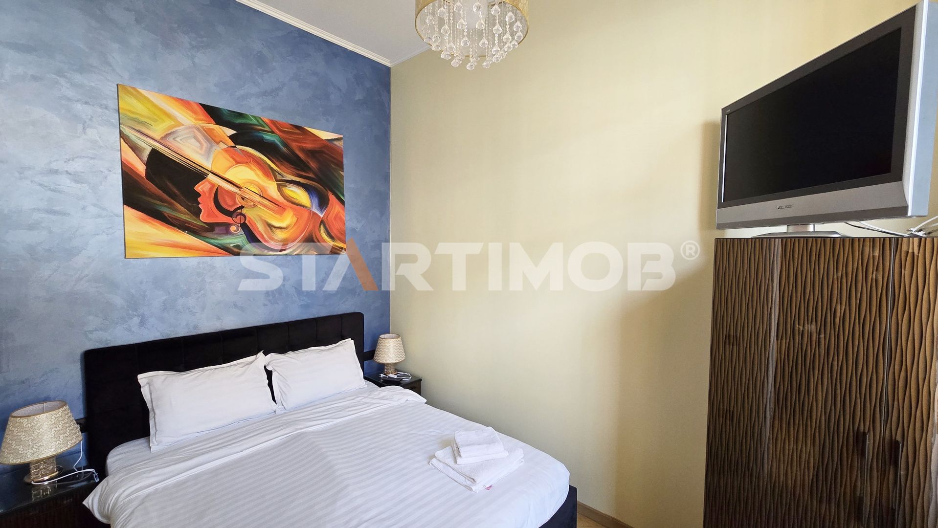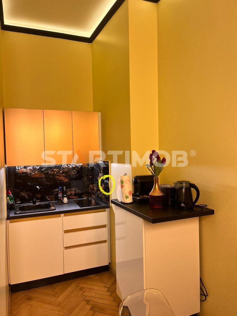 Studioul are o suprafata de 35 mp, si un design minimalist, este compusa din living open space cu o chicinetă complet utilată cu plita, prajitor paine, minifrigider, cafetiera, ibric electric, etc baie cu dus, terasa comuna in curtea interioara a imobilului .